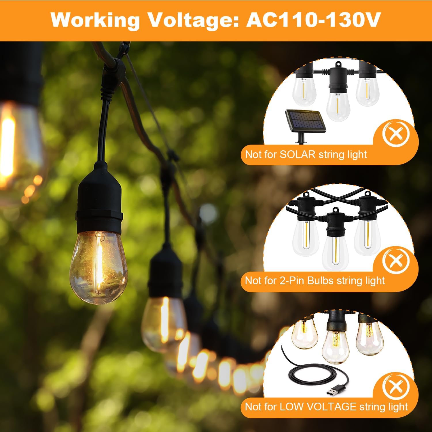 - ⚠️ Warm Tips: WORKING VOLTAGE: 110V-130V, these S14 light bulbs are not compatible with SOLAR STRING LIGHTS or other string lights that operate at a LOW VOLTAGE(such as DC 3V or 6V).