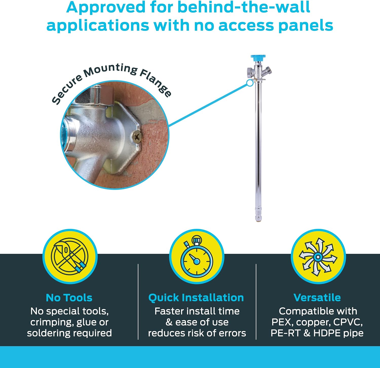 - VERSATILE: Push-to-connect sillcocks work well with PEX, CPVC, PE-RT, SDR-9 HDPE, and copper pipes; ideal for working in tight spaces