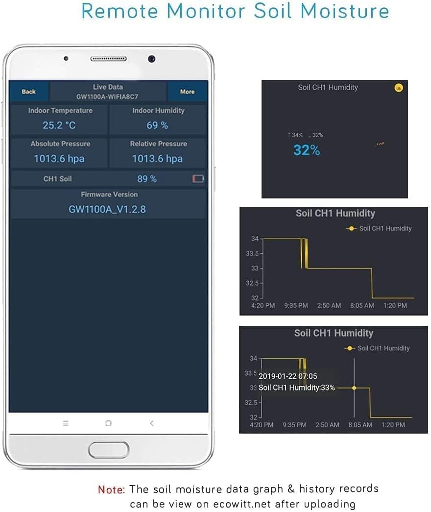 - 【Reliable Wireless Soil Moisture Sensor】: Equipped with advanced chip, ECOWITT WH51 wireless soil moisture sensor collect soil moisture data within 72 seconds when totally inserted into the soil. The data can be transmitted via GW1000/GW1100 Wi-Fi gateway( sold separately ) and the live data can be viewed on WS View Plus or Ecowitt APP after Wi-Fi configuration done.