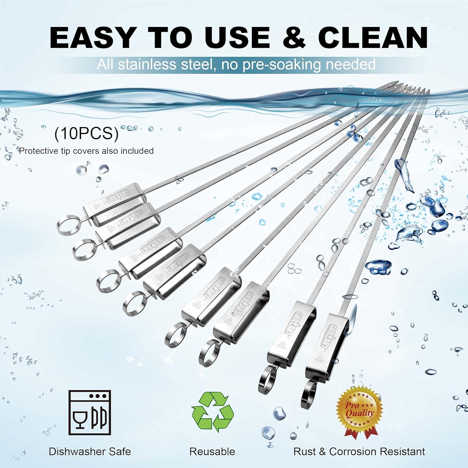 - 【No more food rotating or pre-soaking needed - flat & wide stainless blade】Flat blade, not round, to get you out of the trouble of food spinning, allows you to achieve an even cook a lot easier, so flavor gets much better; Made of thick stainless steel with a smooth finish, so no burrs, no bending, no scorching-so no need to soak for 30 mins ahead each BBQ as you would with wooden/ bamboo sticks, easily save you from loads of unnecessary troubles, and let you only focus on your nice grilling;