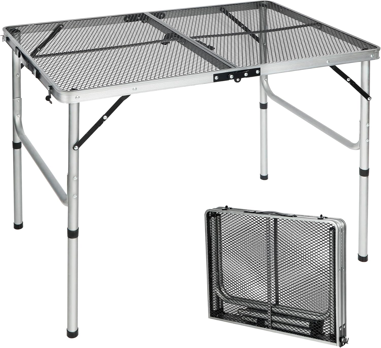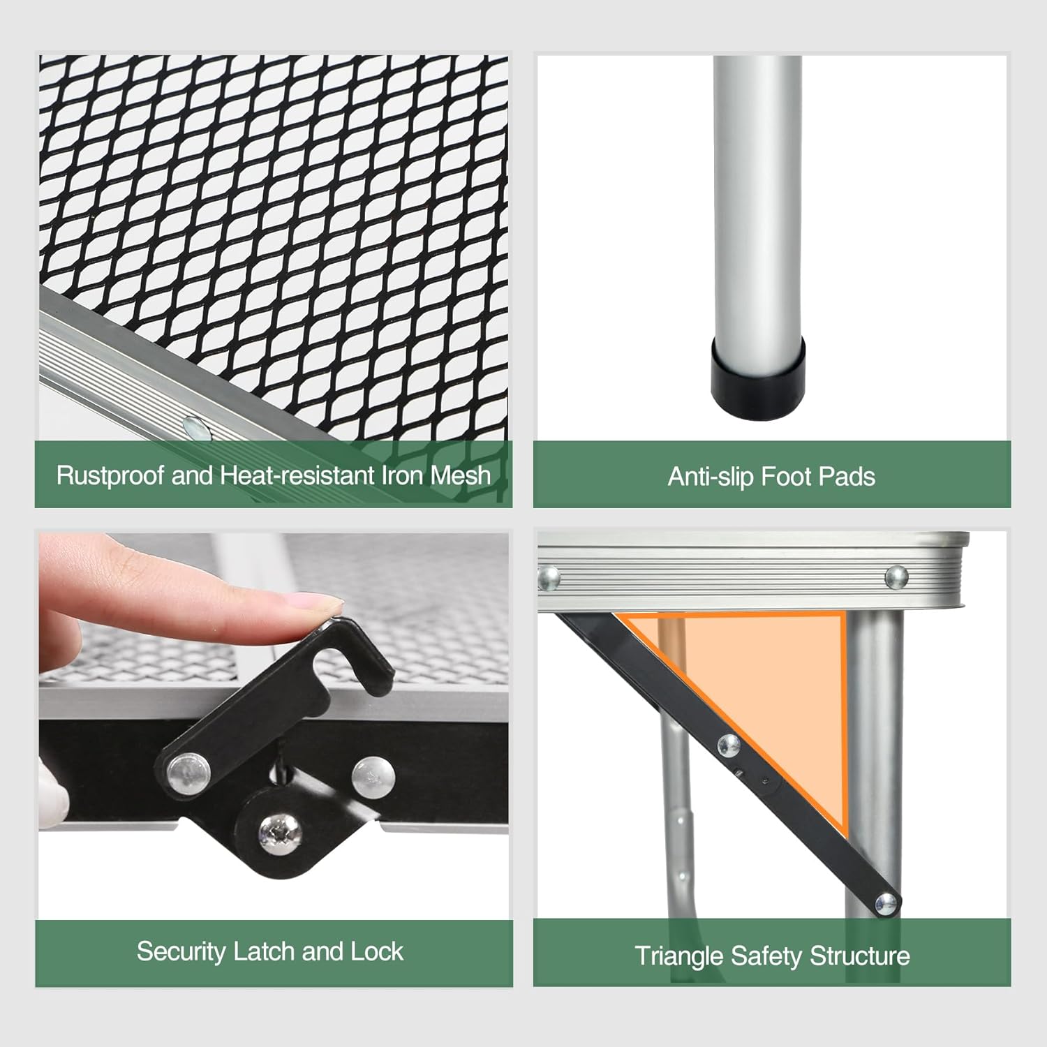 - High strength coated & heat resistant iron mesh (tabletop) and thicker aluminum alloy frame (diameter 25mm). X-shape side support and secure latch to ensure stablity.