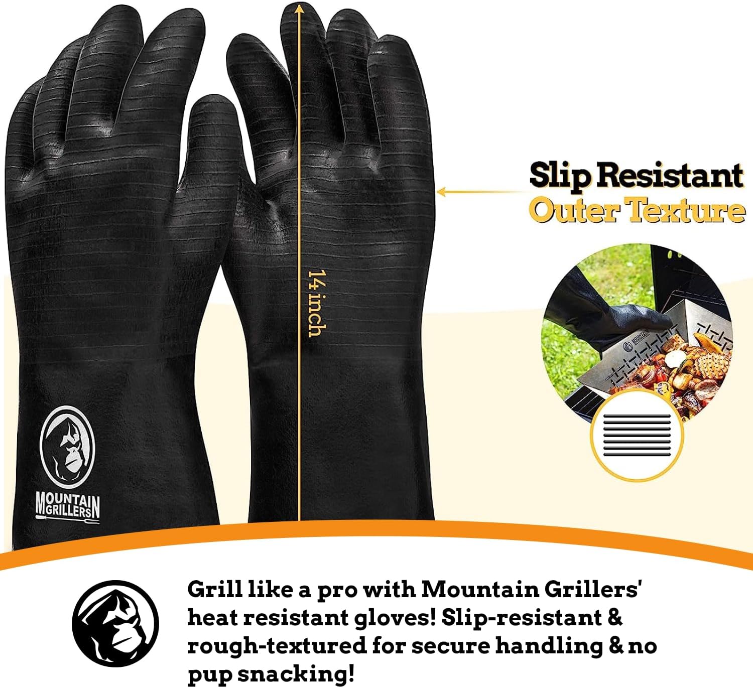 - May you always be surrounded by good friends and better bbq: Mountain Grillers has been a trusted brand by pitmasters around the globe for years, whether you are competing in a competition like Memphis in may or cooking at home? All our products are made from the highest quality materials that are safe and easy to use, so you can focus on the mouth-watering flavor and crispy, tasty char that you crave with our heat proof gloves for cooking