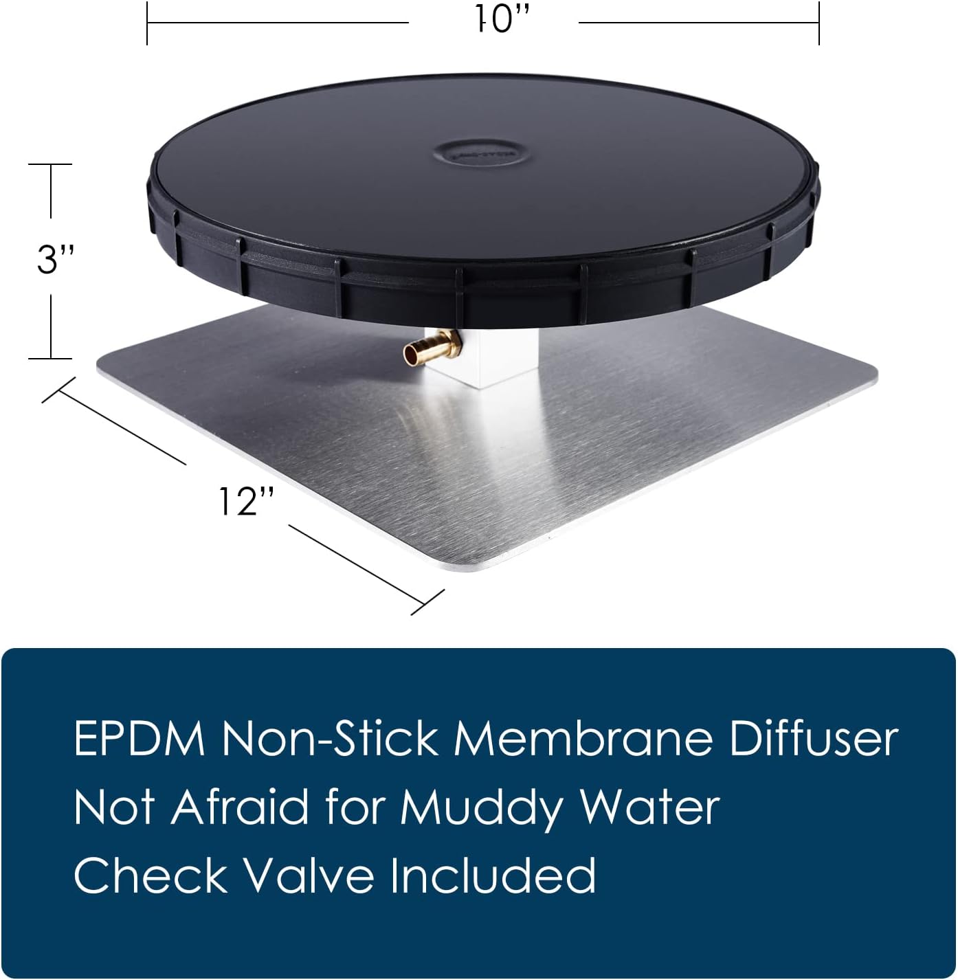 - EPDM non-stick 10” membrane diffuser. 12” square stainless steel base for the diffuser’s stability.