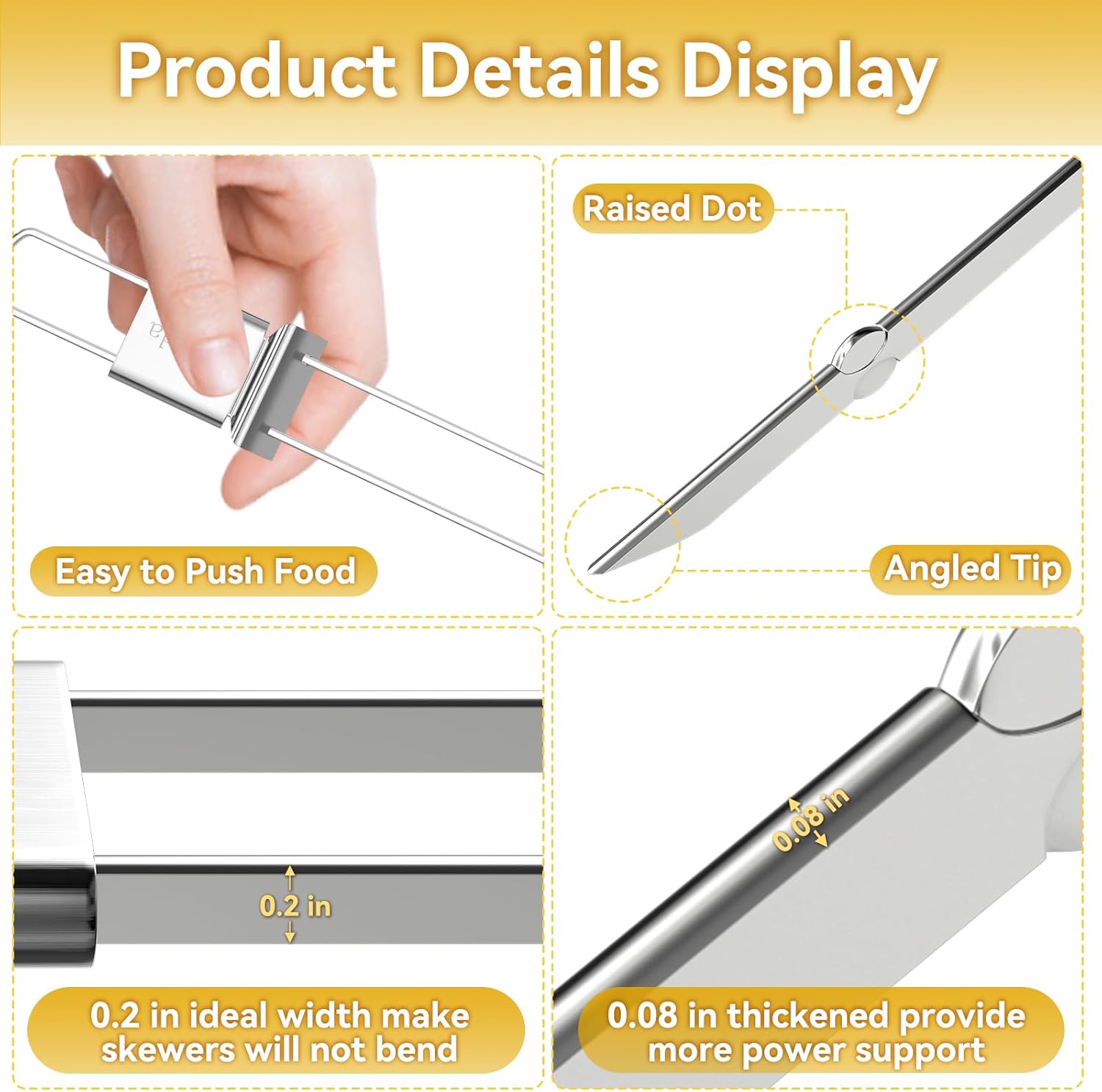 - 【Easy To Push Food with A Slider】The push bar design allows you to easily remove barbecue from stainless steel skewers. Never struggle with stuck ingredients again! Our metal skewers for grilling feature a precision-engineered sliding mechanism for smooth food removal while preserving the rod's flawless surface. The smooth surface enables effortless cleaning, ensuring your kabob skewers retain their like-new condition through countless BBQ sessions. This innovative design streamlines your BBQ workflow from prep station to dining table.