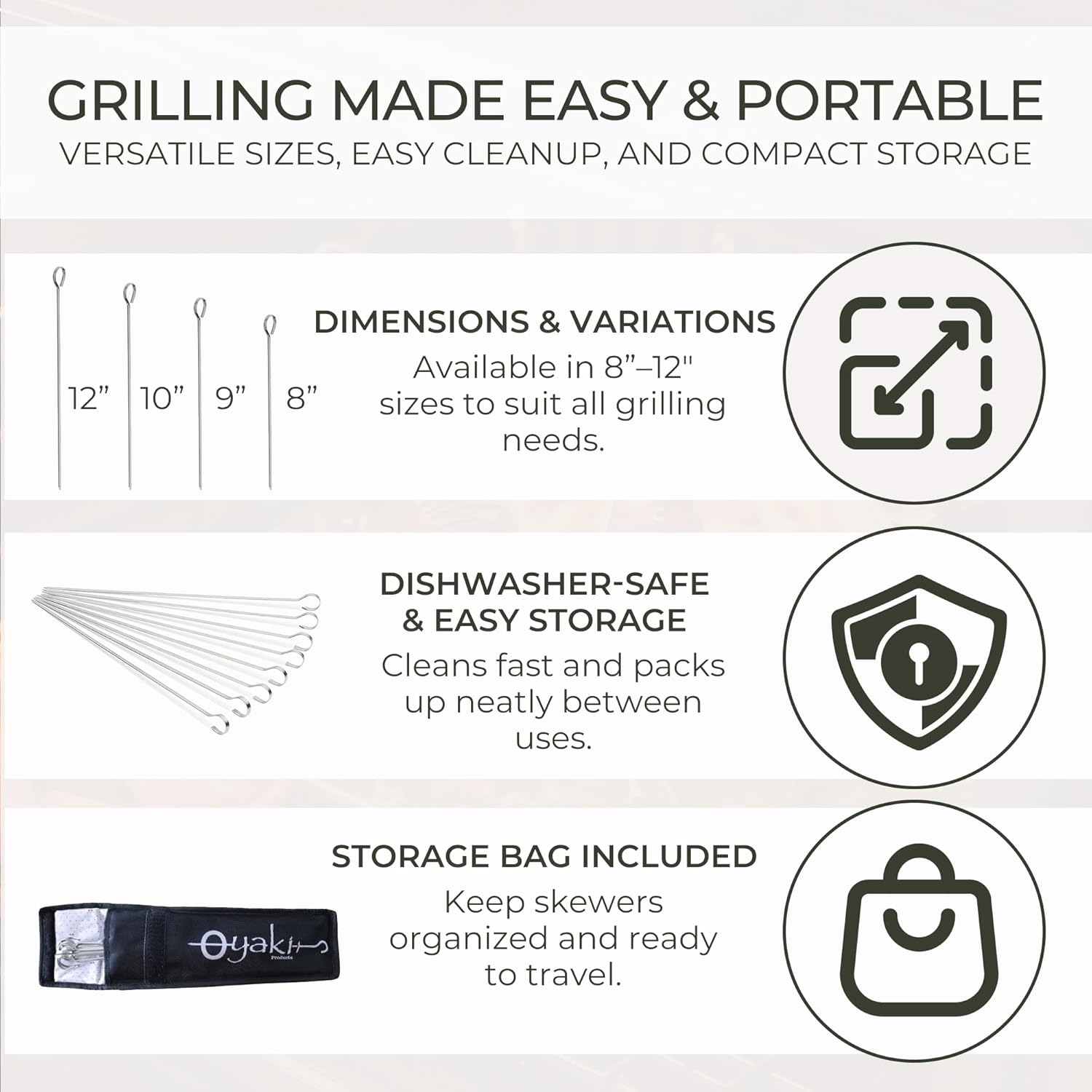 - VERSATILE GRILLING OPTIONS WITH MULTIPLE SIZES: Choose the right length for your grilling needs with O-Yaki’s BBQ skewers available in 8", 9", 10", or 12" sizes. Whether you’re grilling kabobs, roasted vegetables, or meats, these metal skewers are suited for any food and grill setup.