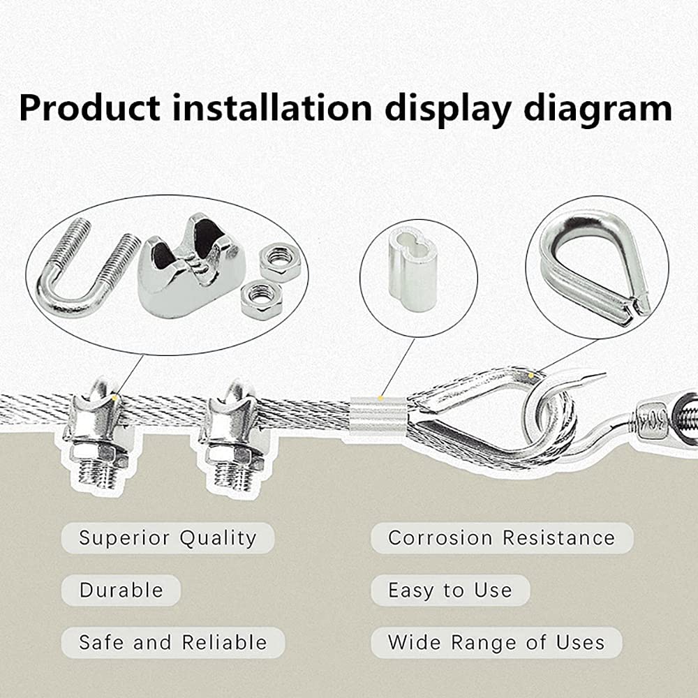 - 【Packaging Information】: Including x 15m/50ft Vinyl Coated stainless steel wire rope,2 x M5 Turnbuckle Tensioners,4x M2 Card header,10 x M2 aluminum sleeve, 4 x M2 thimble, , 4x M6 Sheep eye screw hook 65mm, 4 x plastic anchors