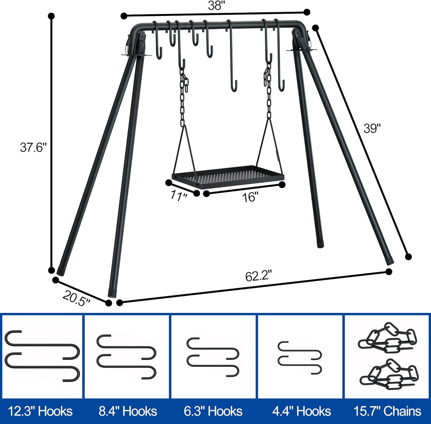 - Campfire Swing Grill Cooking Set:Please rest assured that your safety and health are our top priority!Eco-friendly materials are non-toxic and pollution-free,food can be directly placed on the baking tray,even under high temperature,it will not produce hazardous substances!Each campfire grill swing set comes with 8 hooks in different length,a large swing tray,two chains,and a convenient storage bag for easy transport and storage