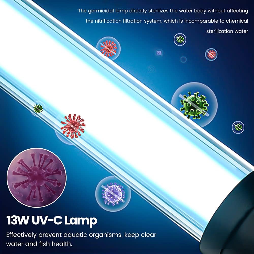 - 4 in 1 multifunctional system: 1. Filtration: The 37W pond pump can filter multiple times to purify the water quality. 2. Lamp: 13W work lamp effectively inhibit aquatic organisms and keep fish clean and healthy. 3. Pumping: The pumping flow can be adjusted to meet the daily pumping needs of the pond. 4. Fountain: Two fountain styles add charm to your pond.