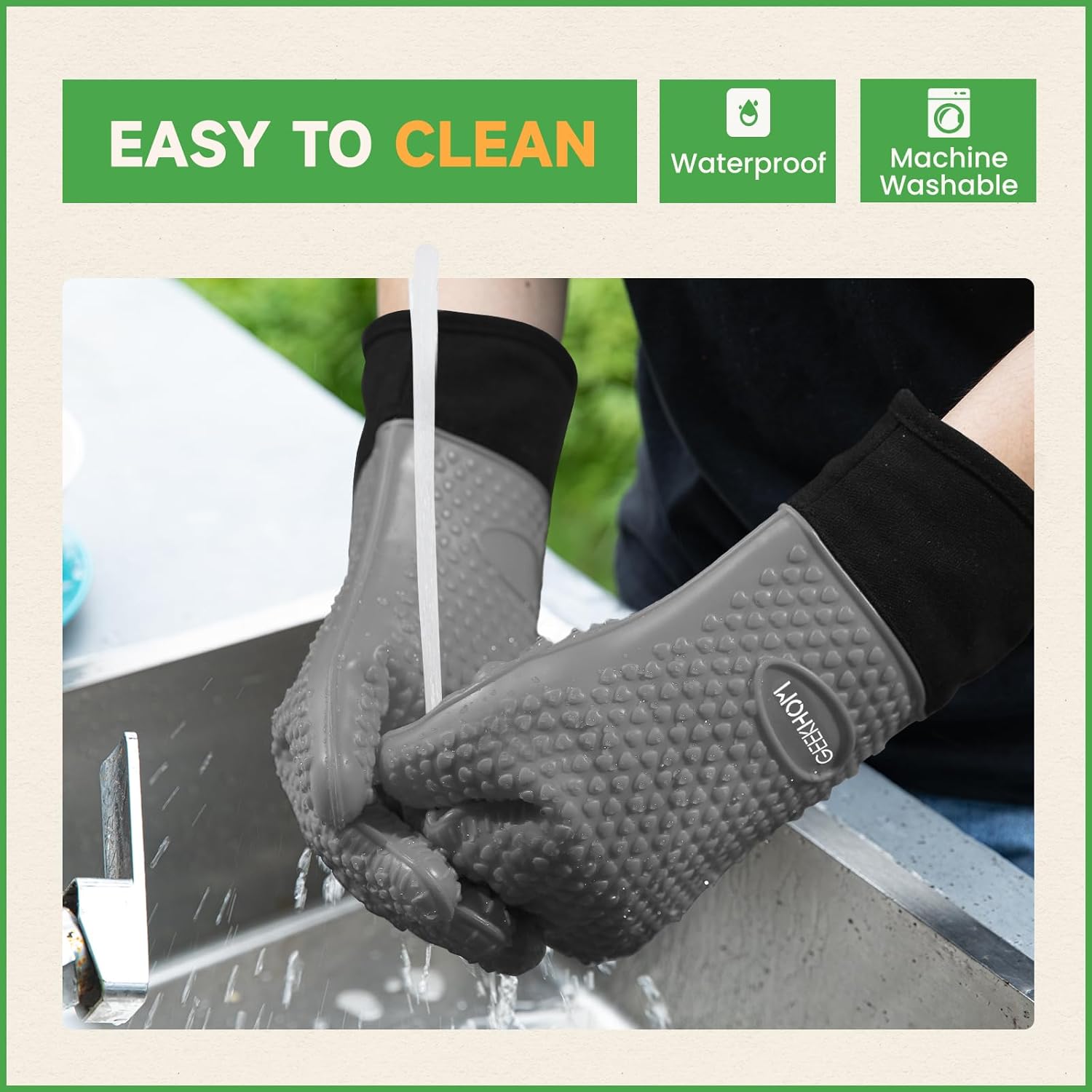 GEEKHOM BBQ Gloves Heat Resistant Oven Mitts - Silicone Grilling Gloves with 13.7" Arm Protection - Waterproof Pot Holder Non-Slip for Men & Women, Kitchen Outdoor Cooking, Baking, Camping, Light Gray