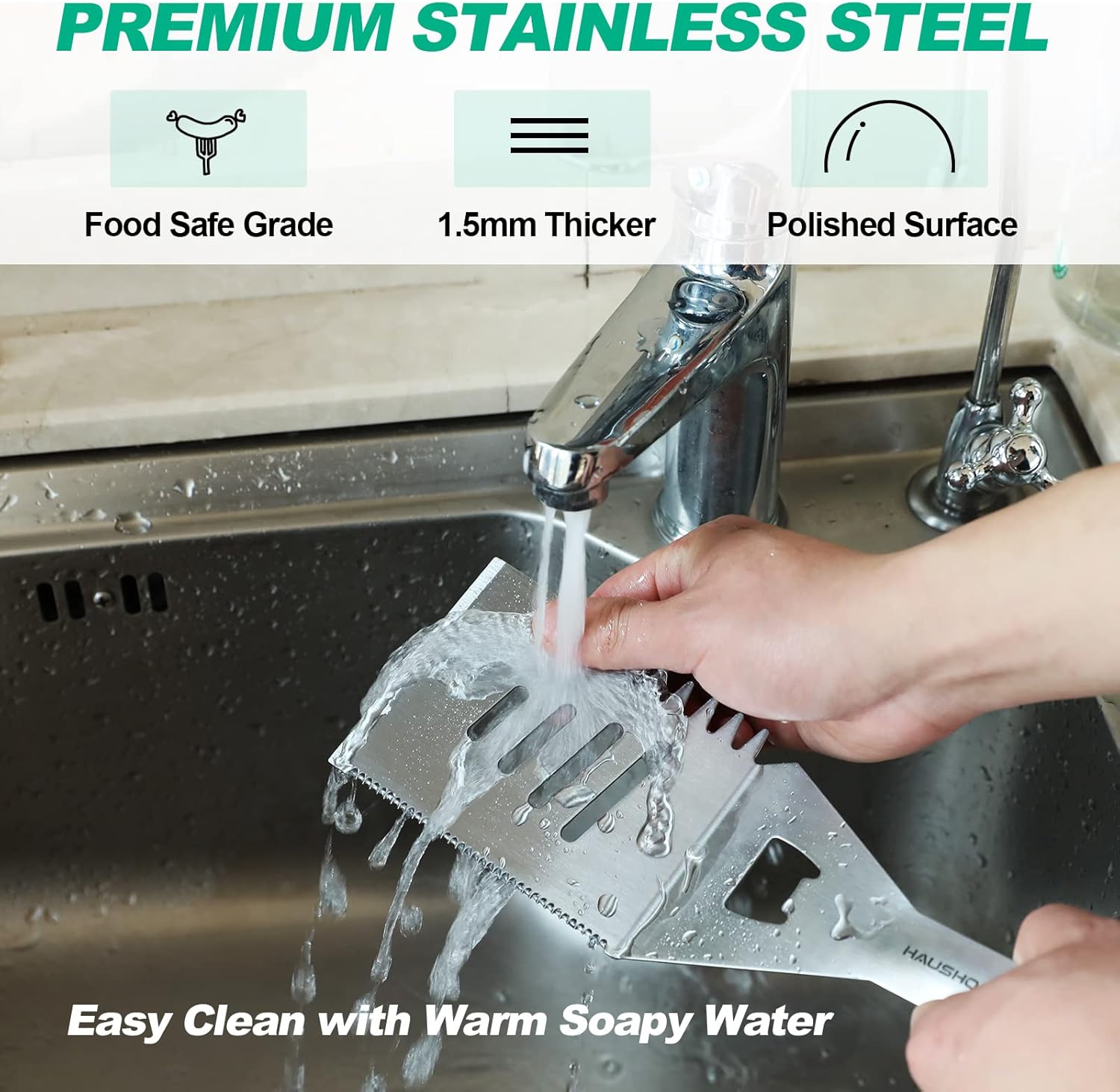 - Easy to Clean & Upkeep: Polished stainless steel can be easily cleaned with warm soapy water. Extra large hanging loops to fit all grill hooks