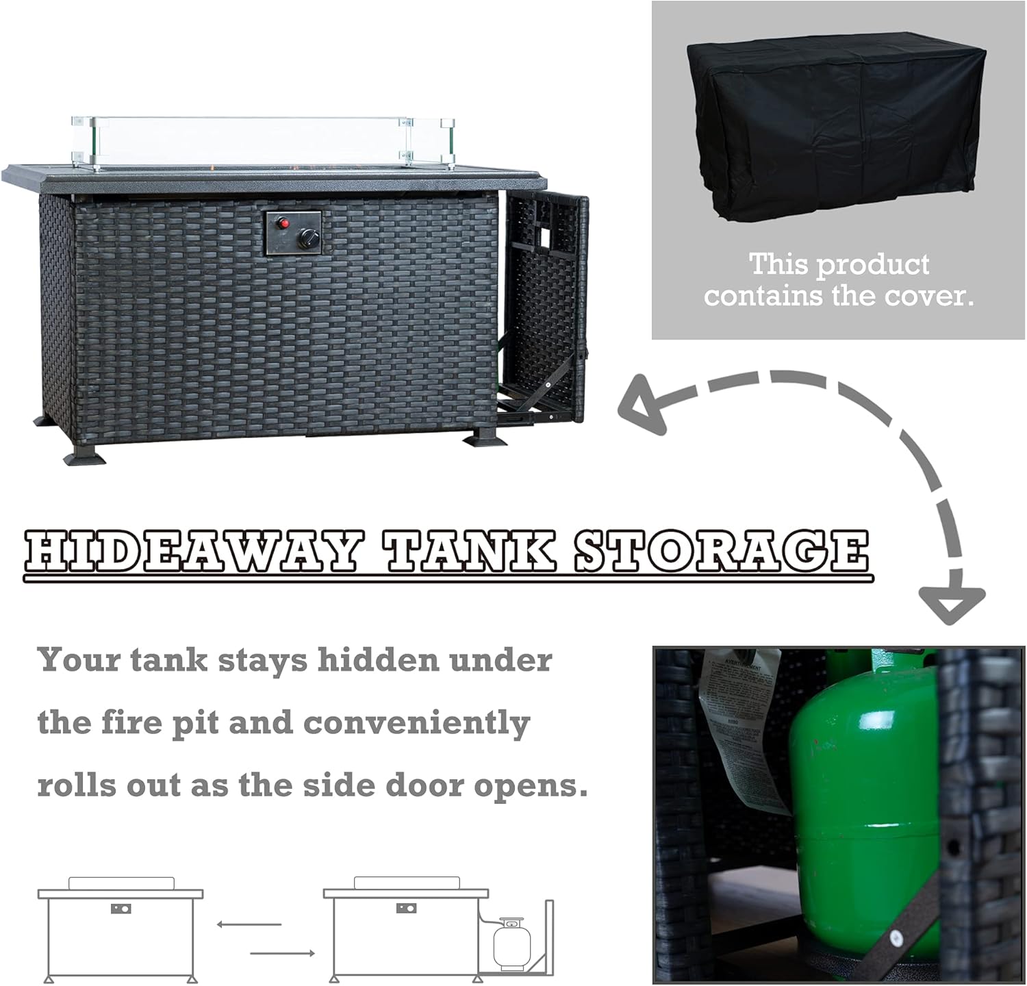 - ✅Slide Out Tank Holder - The patio fire pit table has a slide-out tank holder, making it easy to change the propane tank when needed.