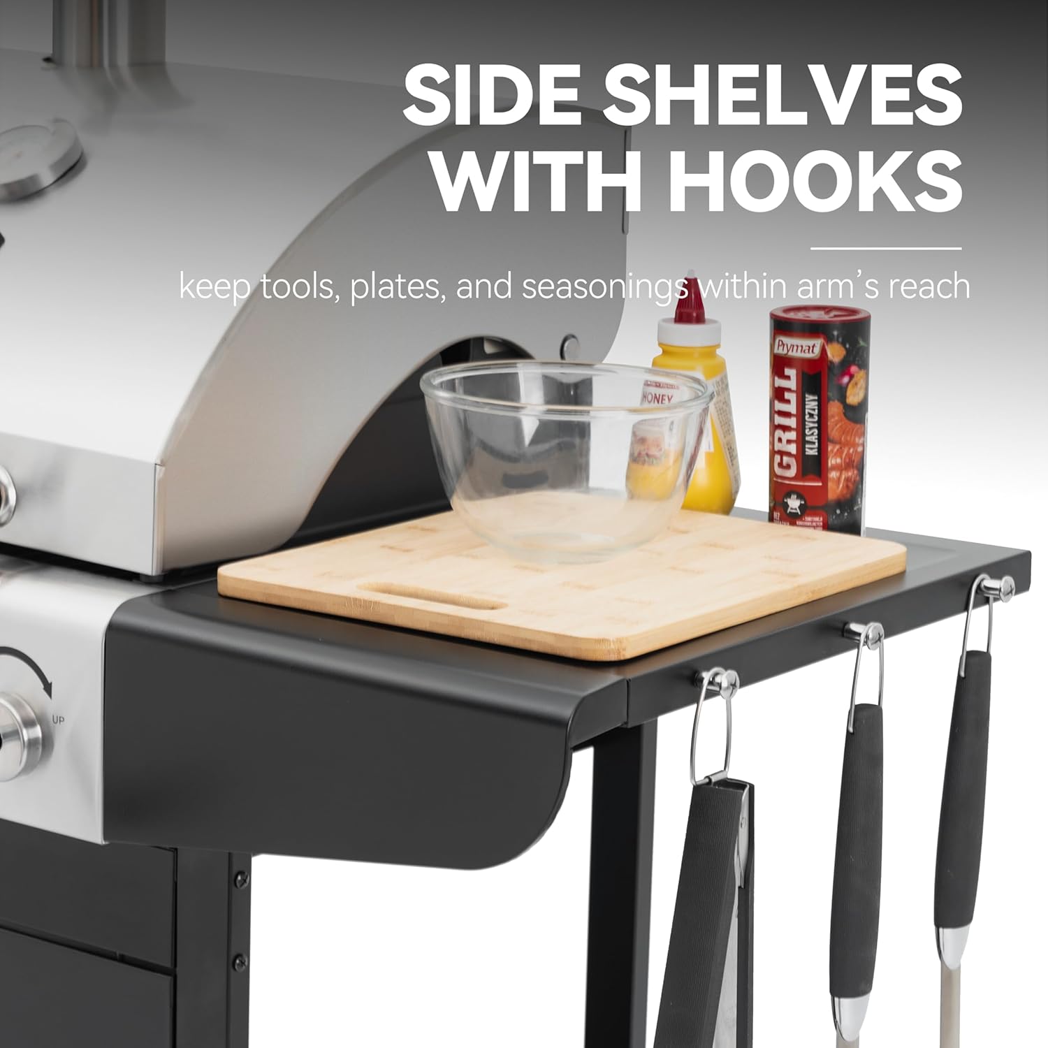 - Extra Prep Space: Two side shelves keep your grill tools, plates, and seasonings within armβs reach, offering extra prep space. 3 hooks are integrated on both sides for hanging grill accessories.
