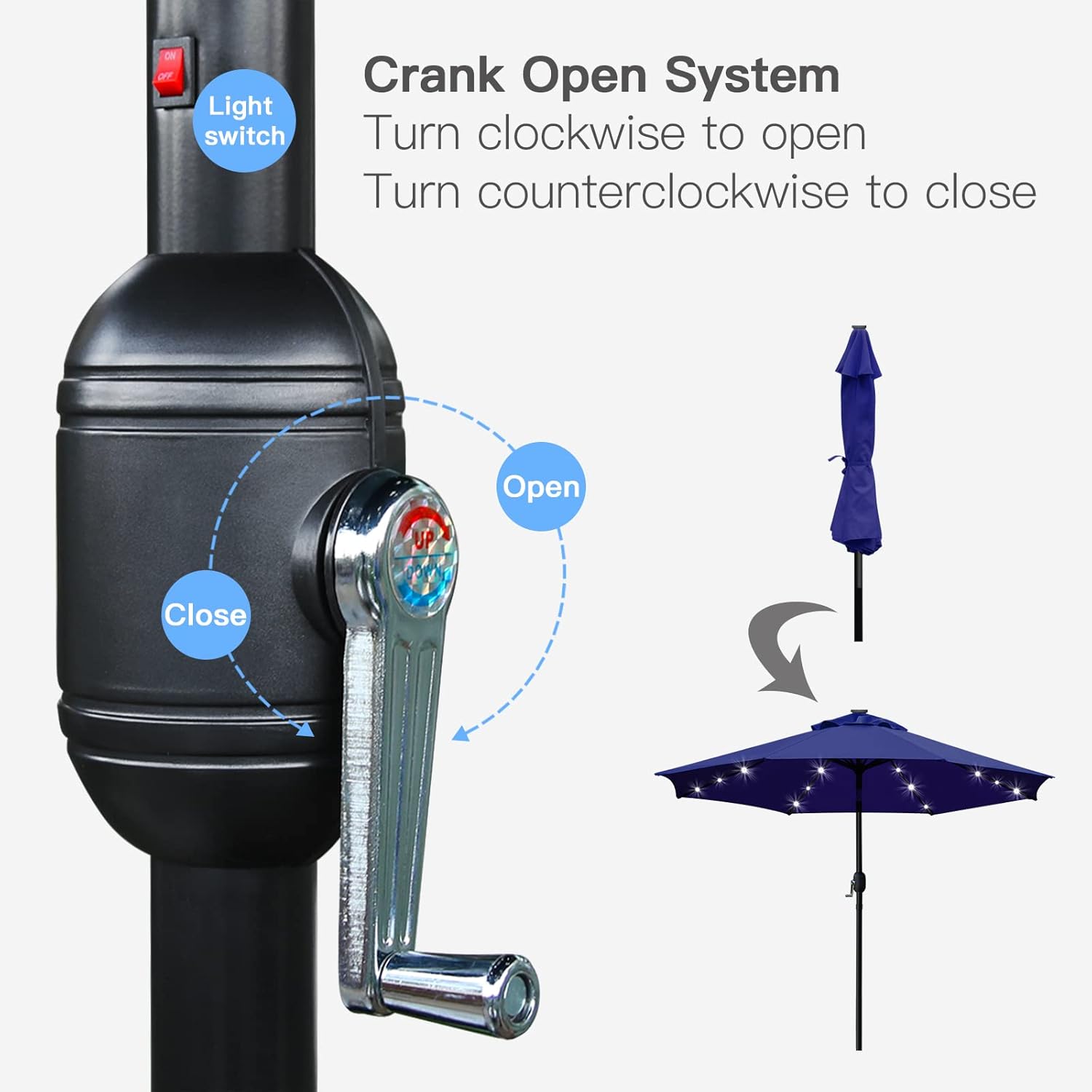 - Convenient crank opens/closes system and handy push button tilt, even easy to use for kids and the elderly. Keep the sun at the back in the daytime.