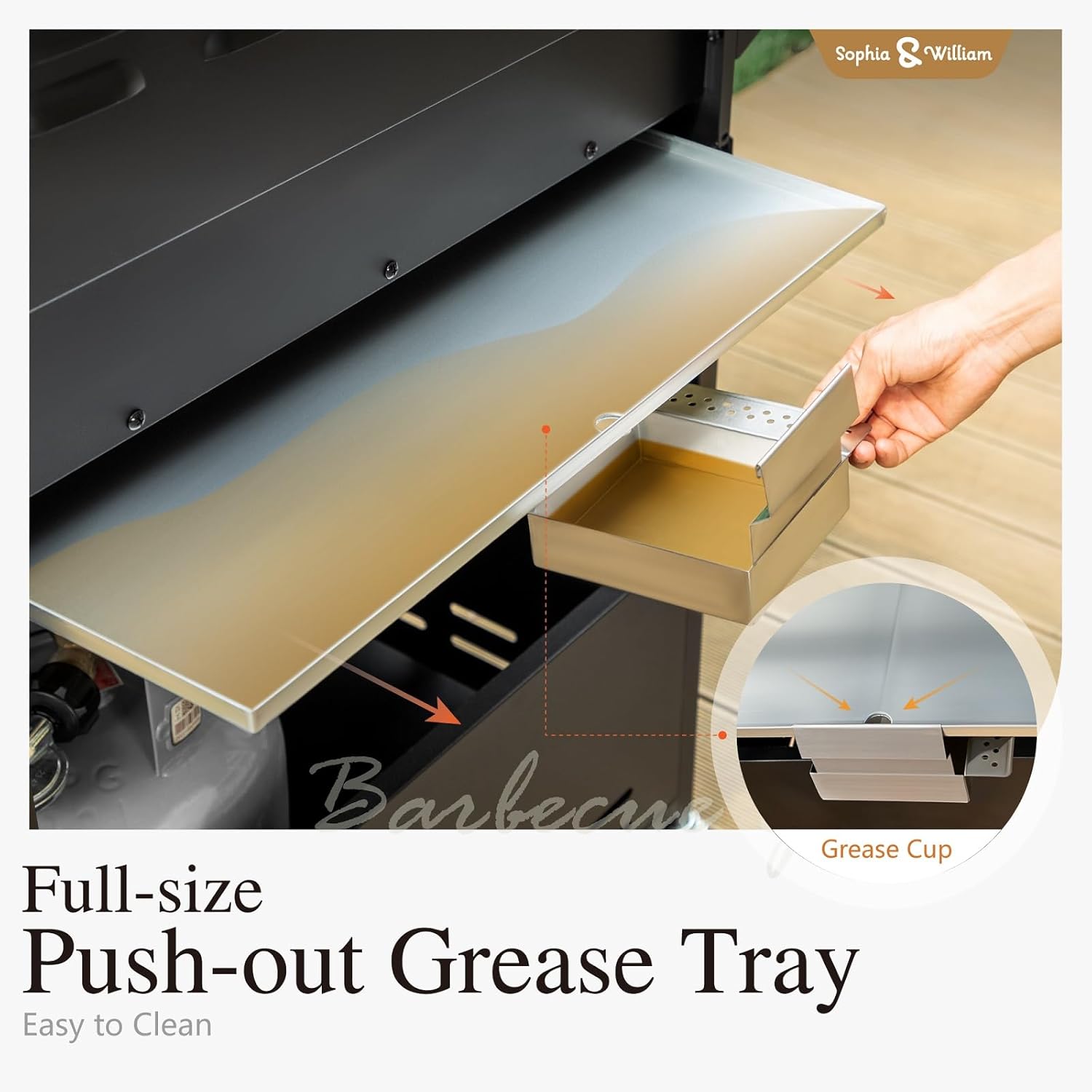 - ššš¬š² ššØ šš„ššš§: The full-size grease tray slides out smoothly, making it a breeze to deal with grease and drippings while you're grilling. Plus, the handy cup lets you easily get rid of the collected grease, keeping the post-grill cleanup hassle-free. This design also ensures your food tastes its best by preventing excessive grease from affecting the flavor