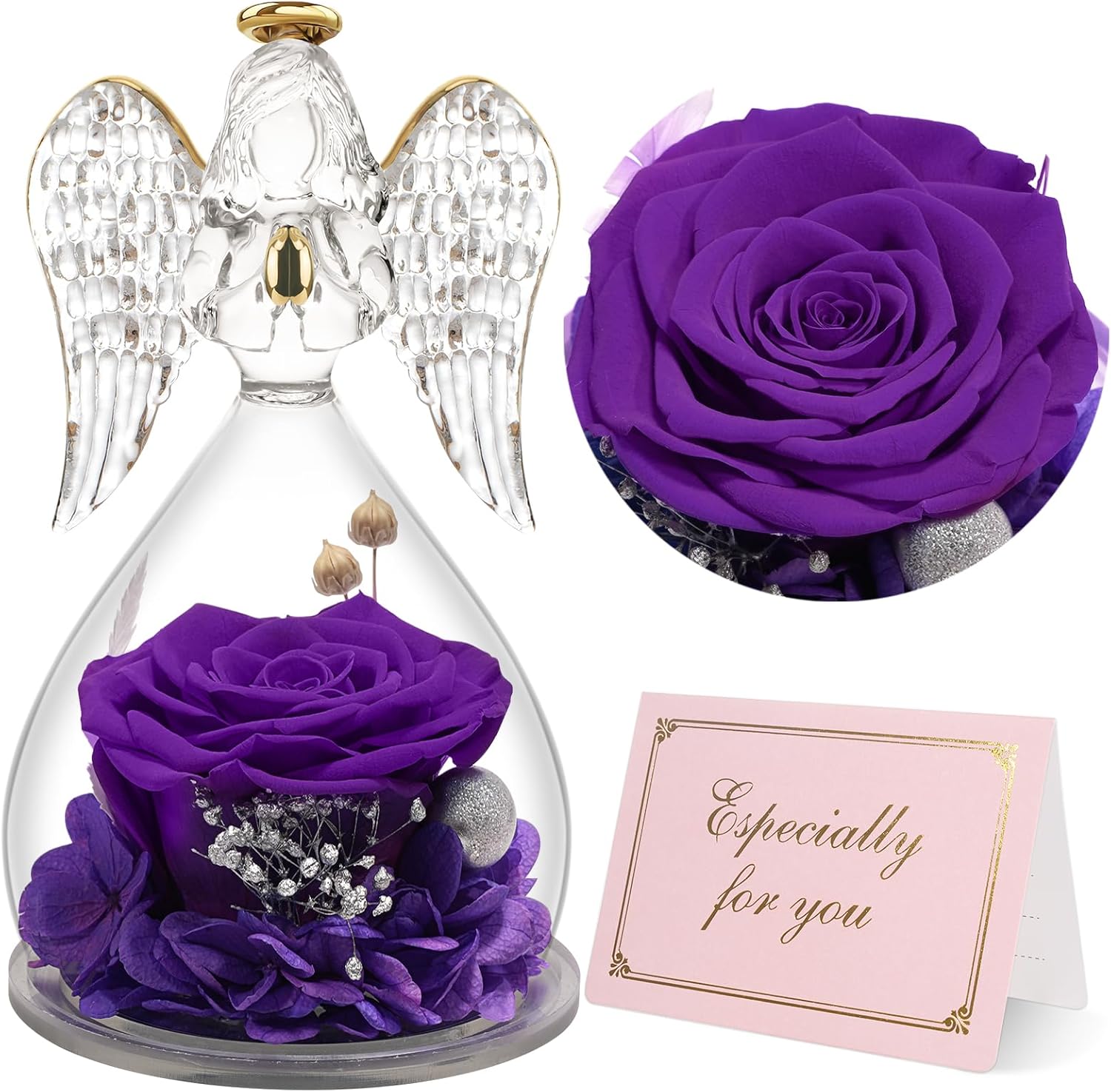 Yamonic Angel Figurines With Real Preserved Rose - Mom Birthday Gift for Grandma, Women - Mother's Day (Purple)
