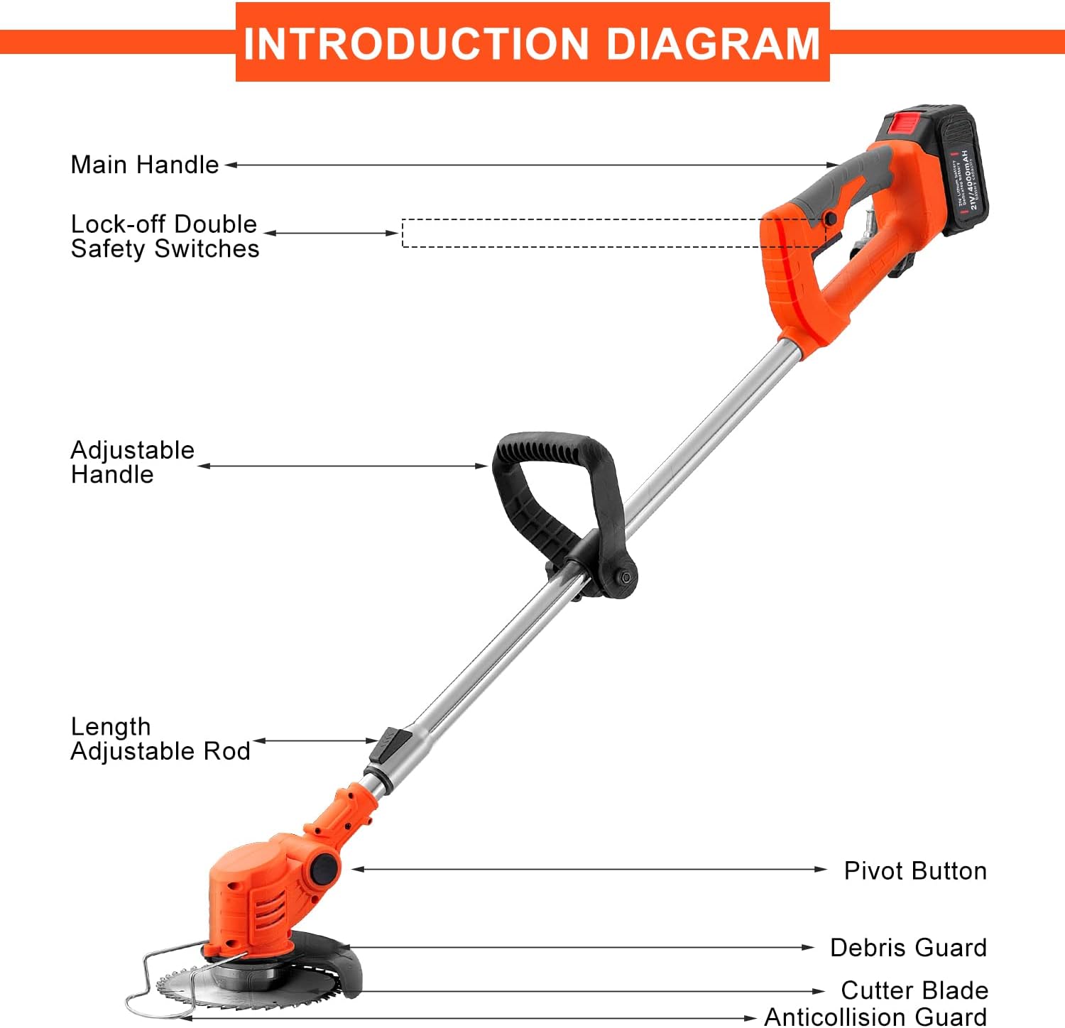 - 【Lightweight& Portable】-the weight of this Grass Trimmer is only 3 pounds,Not tired even use it all day,senior citizen and women can use it.Package Include 2*21V 4.0Ah battery, 1*Charger,2* saw blade,8 * steel cutting Blades, Metal blades are sharper and more durable than plastic blades and conventional string trimmer.