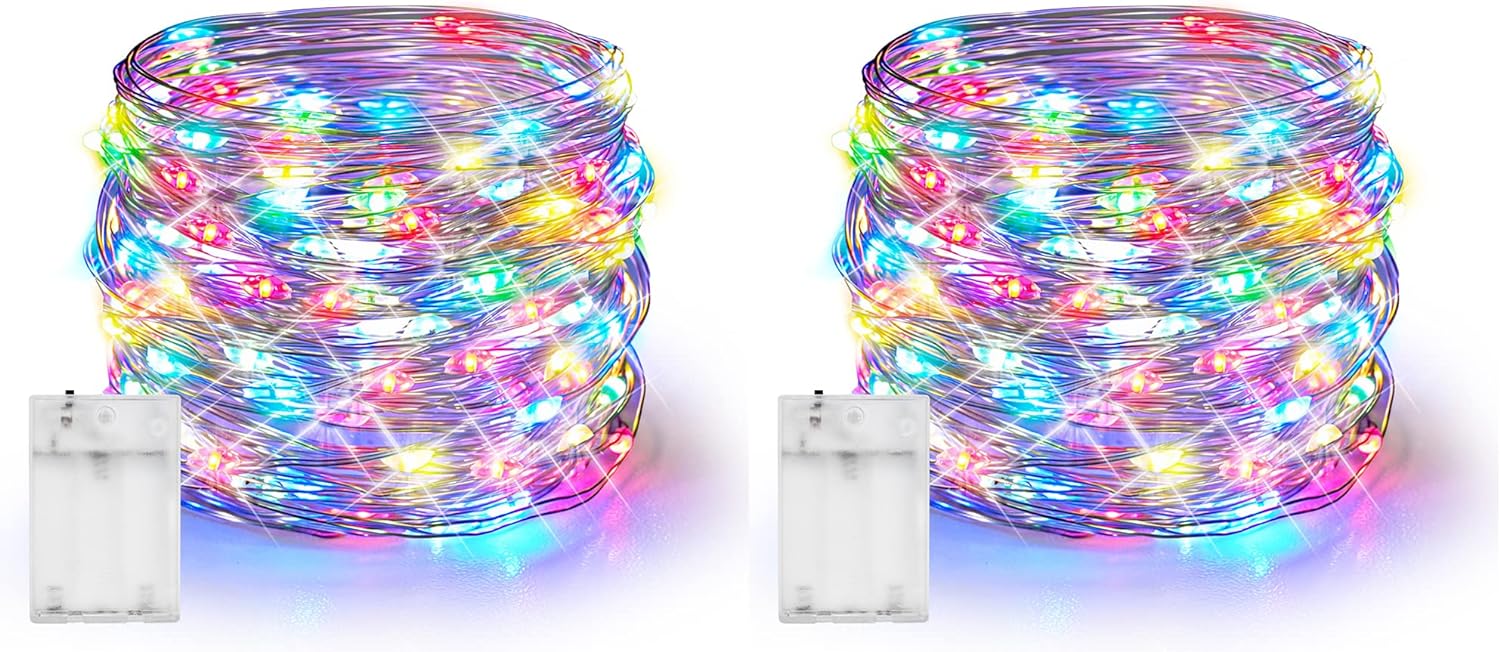 Dazzle Bright Fairy Lights Battery Operated, 2 Pack Total 40FT 120LED Silver Wire Waterproof String Lights, Christmas Decorations for Indoor Outdoor Bedroom Yard Decor, Multi-Colored
