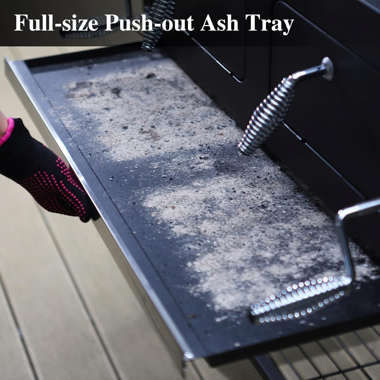 - ššš¬š² ššØ šš„ššš§: This heavy duty extra large bbq charcoal grill has individual dual doors with cool-touch metal handle on the front cover where you can add fuel (or re-arrange the hot coals) while cooking without having to move the food or remove the grills. Full-size push out ash pan is removable for quick and easy clean-up ashes