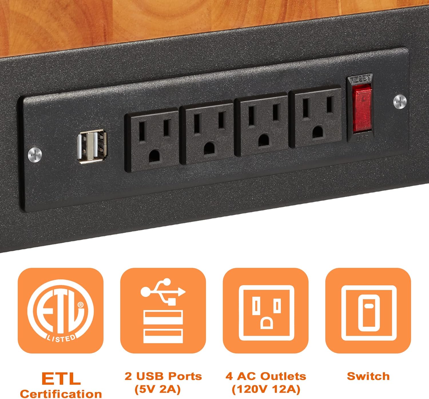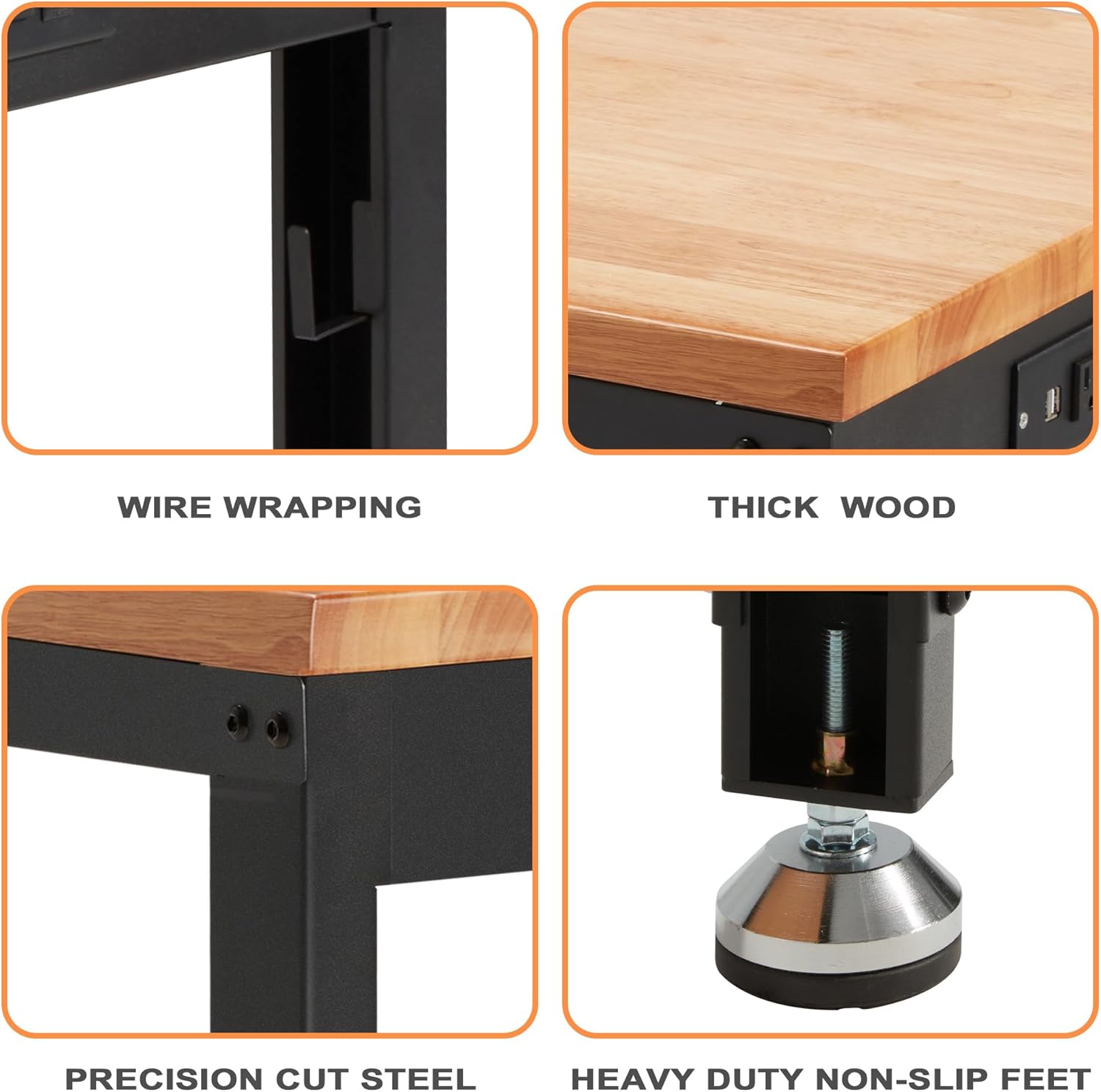 Haddockway Adjustable Workbench for Garage,48"x 24" Rubber Wood Top Worktable with Power Outlets, Max 2000 Lbs Load Capacity Heavy Duty Workstation for Workshop Office Home (Black Frame, 48in)