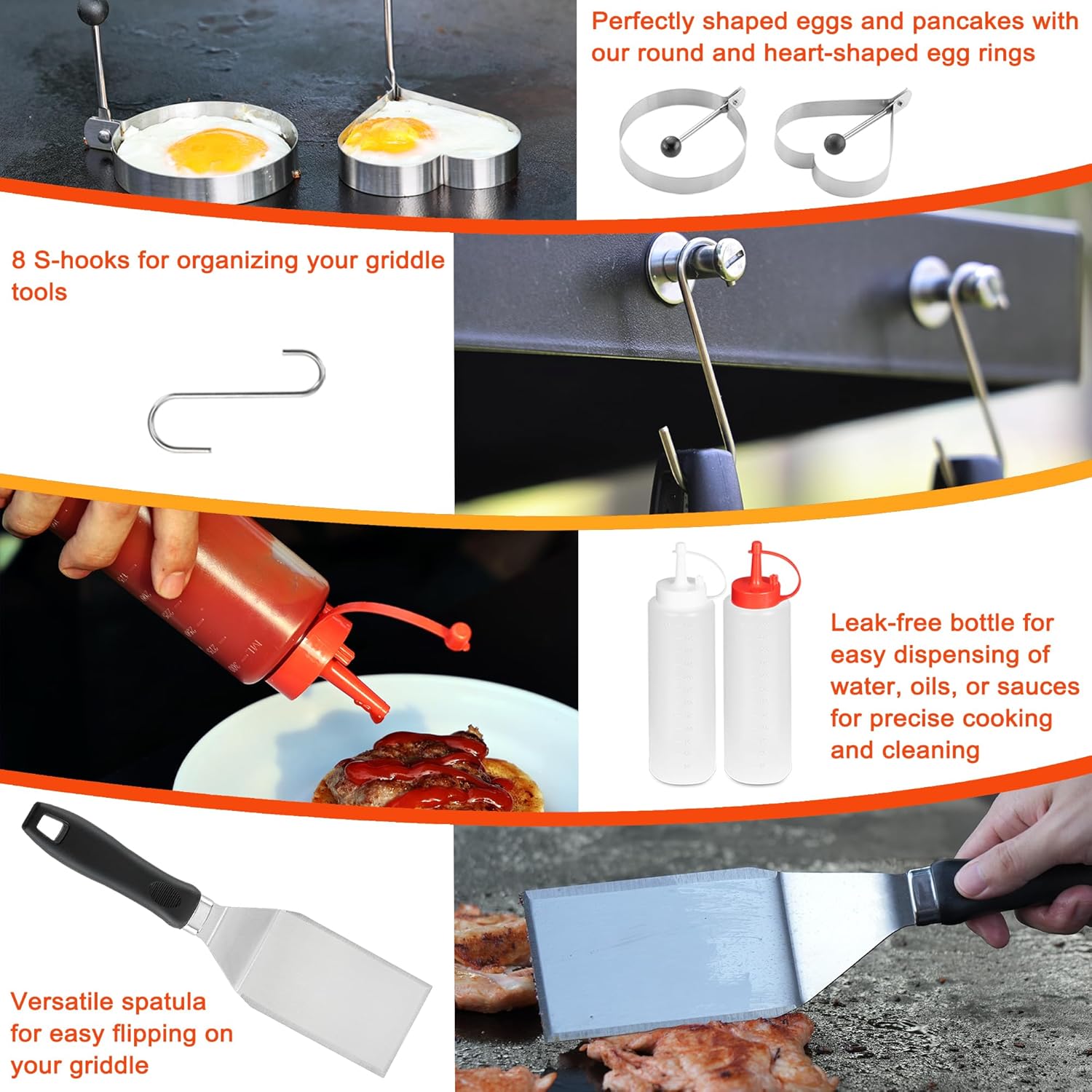 - Complete Griddle Accessories Set: 39-piece kit featuring essential griddle tools including oversized spatulas, burger turner, melting dome, burger press, grill tongs, fork, sauce brush, scrapers, squeeze bottles, egg rings, spice shakers, silicone glove, scouring pad with handle, corn holders, and hanging hooks