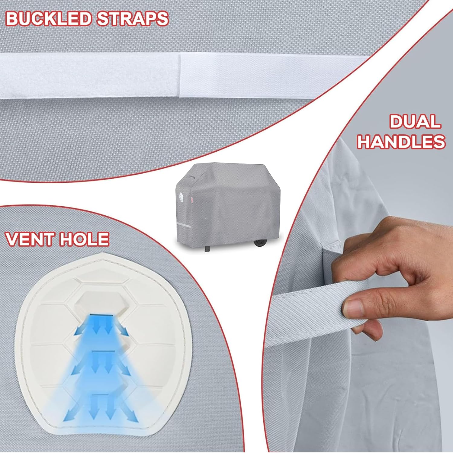 - 【Feature】- Durable handles and straps on both sides for fixing the cover. Handles provide convenience for fitting and removal. Straps help tighten and prevent the cover from being blown off. The air vent hole would ensure that your gas grill wouldn't become dirty and keep dry.