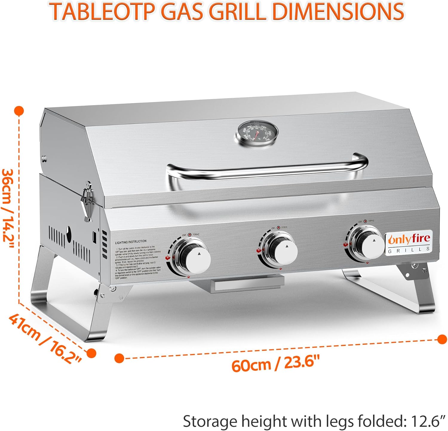 - PREMIUM HEAVY DUTY STAINLESS STEEL CONSTRUCTION: The Onlyfire portable gas grill is made of high quality stainless steel to ensure duarability and longlife use. The 286 square inches stainless steel cooking grate allows you to enjoy delicious grilled food no matter where you are. Perfect for camping, tailgating, picnics, RV trip and backyard BBQ gathering.