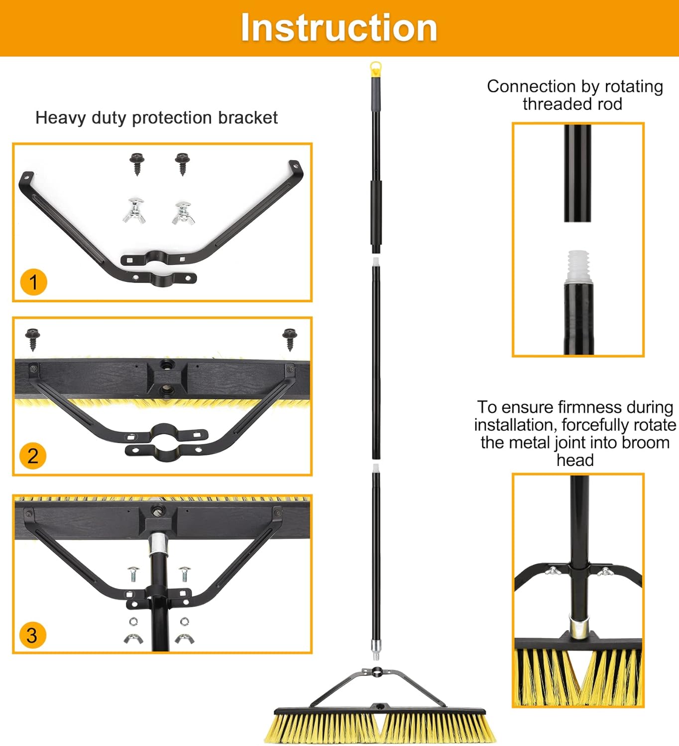 - 24" Wide Stiff Broom-The garden brush head has great width for sweeping wide area with a generous amount of bristles ,it has two handle slot ,can be swapped sides if you find the bristles are wearing unevenly.
