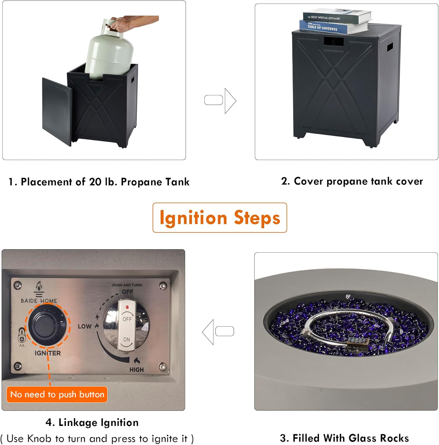 - Boasting a robust 50,000 BTU heat output, this outdoor fire pit table provides powerful and effective warmth. It features electronic ignition and a flame control knob that allows you to adjust the flame size from low to high. Utilize a standard 20 lb propane gas tank (Tank not included).