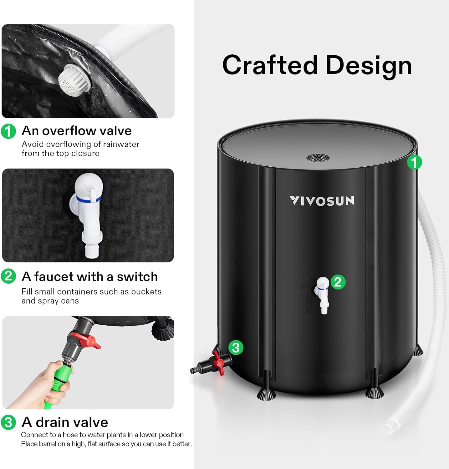 VIVOSUN Collapsible Rain Barrel, 53 Gallon Water Storage Tank with 1000D Oxford Cloth, Portable Rain Collection System Includes Two Spigots and Overflow Kit, Black