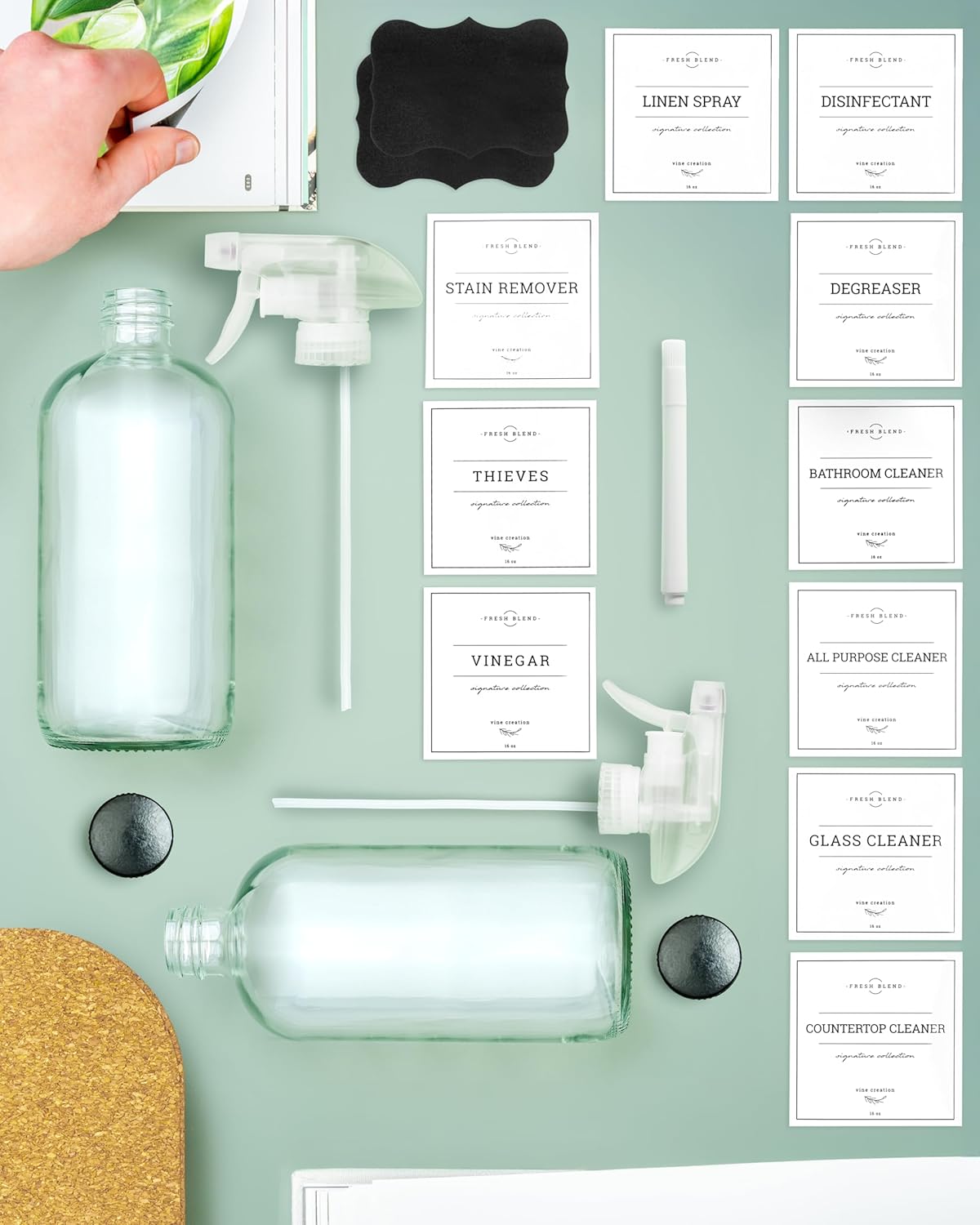 - PREMIUM WATERPROOF LABELS - Ten elegant high-end labels included, glass cleaner, countertop cleaner, vinegar, all purpose cleaner, thieves, bathroom cleaner, degreaser, disinfectant, linen spray, and stain remover. Durable and waterproof for daily use. Additionally two chalk labels for any other needs, white marker is included. Premium Labels measurement 3" x 3".