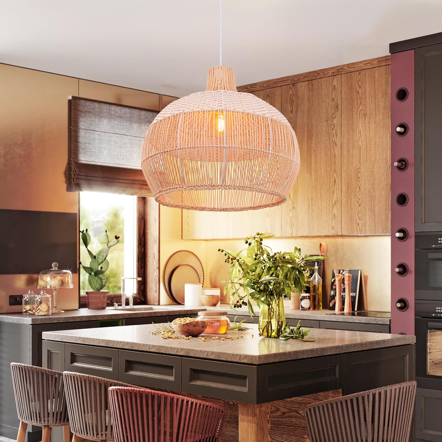 Arturesthome White Handwoven Rattan Boho Pendant Lighting Fixtures, Wicker Hanging Ceiling Light Chandelier, Handmade Woven Basket Lampshade for Kitchen Island