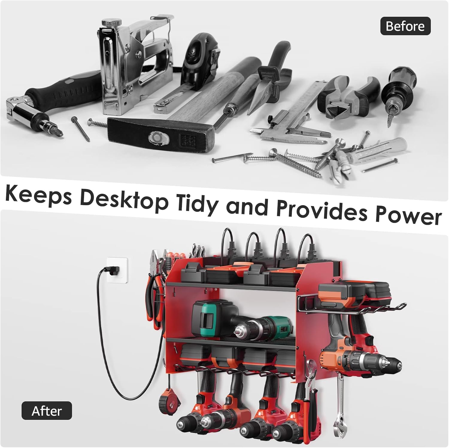 - Wall mount power tools organizer come with 6 slots drills holder, 4 hooks, 2 shelves and drill bit rack, built-in power strip, 3 layer structure can keep different rechargeable tools organized in the work area and save your bench space.