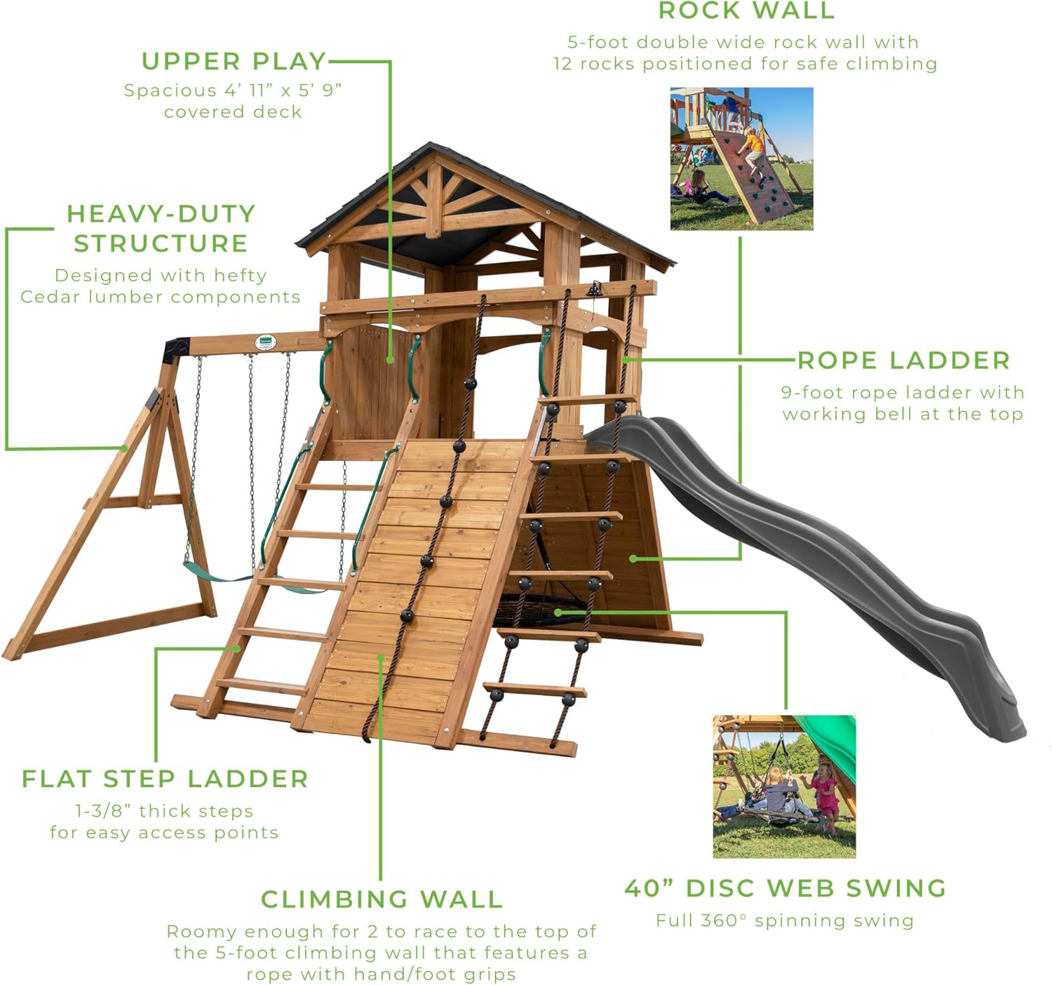 - Climbing Rope Ladder: 9-foot-tall rope ladder with wooden rungs offers adventurous climbing fun, leading to a victory bell to celebrate the summit