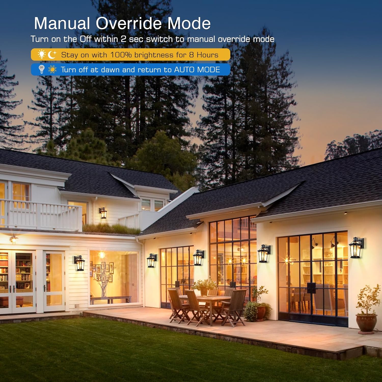 - ๐ [ Latest Motion Sensor ] Our porch lights outdoor for your home now come equipped with a modern motion sensor that includes four working modes: โ DIM MODE: 100% brightness when motion is detected at night, 30% brightness the rest of time. โกECO+ MODE: Keeps the lights off at night, turning on at full 100% brightness when motion is detected. โขD2D Mode: 100% brightness at night, turns off automatically at dawn. โฃOverride Mode: Maintains 100% brightness for approximately 8 hours, but automatically turns off at dawn and reverts to the previous operating mode.
