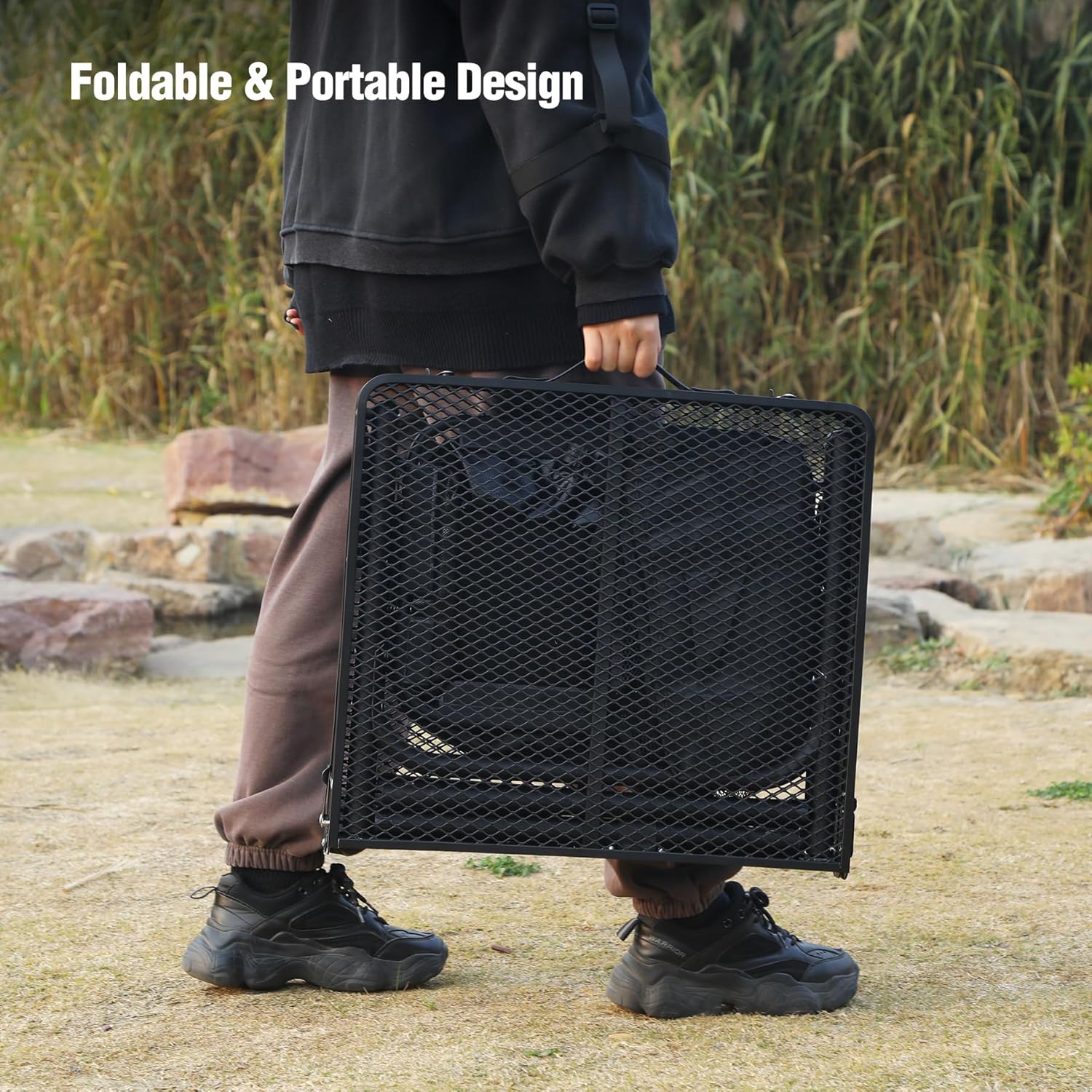 - Superior Material: The tabletop of this folding grill table is made of powder coated iron mesh, wear-resistant, high-temperature resistant, and can be used for a long time. Its framework is supported by φ25mm aluminum alloy tubes, which is stable enough and can hold up to 66lbs/30kg. The feet with cover can effectively prevent from slipping.