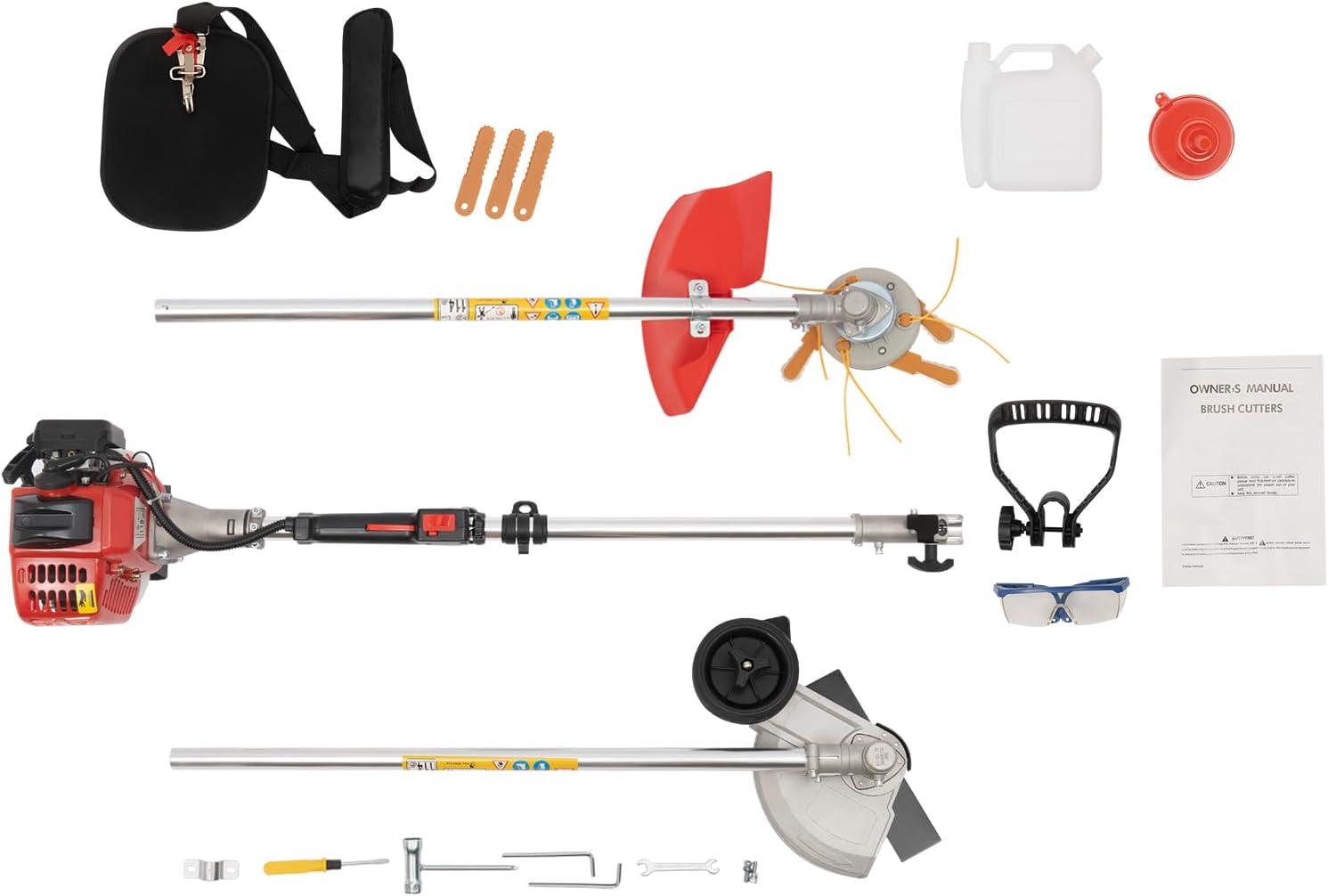 - 【Safety Protection】Throttle safety lock prevents accidental touching of the gas pedal and ensures the safety of the user during operation. Large capacity fuel tank: 33.8 oz. Large capacity fuel tank ensures long term use without frequent refueling. Grass stopper: Can effectively prevent the grass from splashing around when mowing, convenient to clean up the lawn after mowing, ensure your safety. Funnel: The red funnel is convenient for adding fuel and not easy to leak.