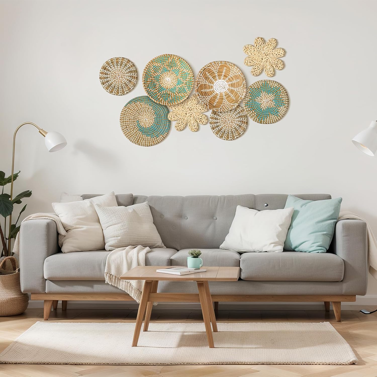 Xuhal Set of 8 Hanging Woven Wall Basket Handmade Decorative Rustic Boho Basket Decor Handcrafted Wicker Round Seagrass Wall Art for Home Kitchen Farmhouse Table Living Room