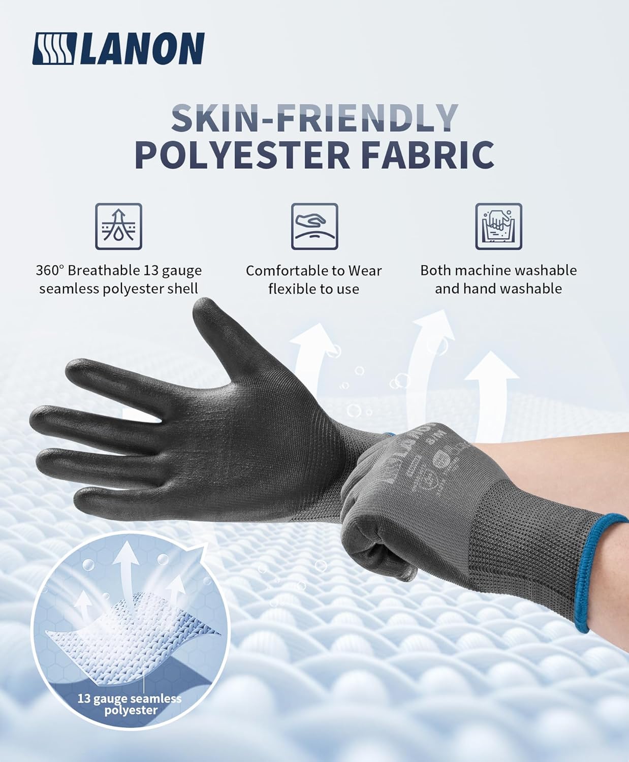 LANON 18 Pairs Safety Work Gloves, Mechanic Working Gloves for Men,Breathable PU Coated, Seamless Knit,Double Wash, Grey, X-Large