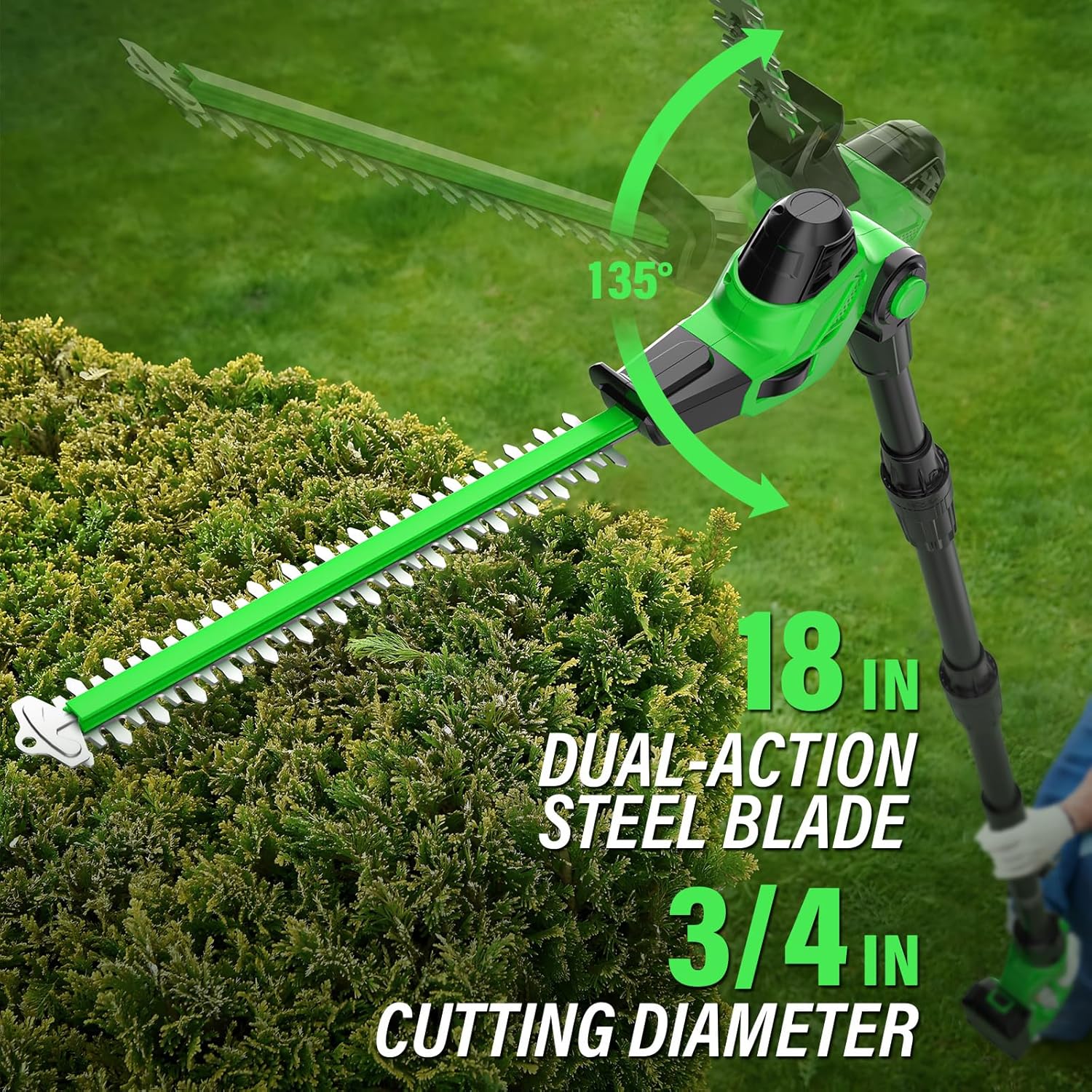- [SUPER CUTTING CAPACITY] The 18-inch double-action laser cutting blade brings you a highly efficient hedge trimming experience, allowing you to reduce vibration during smooth cutting. The 3/4-inch cutting spacing accommodates pruning needs of different branch sizes. It is a good helper for you to trim your hedges.