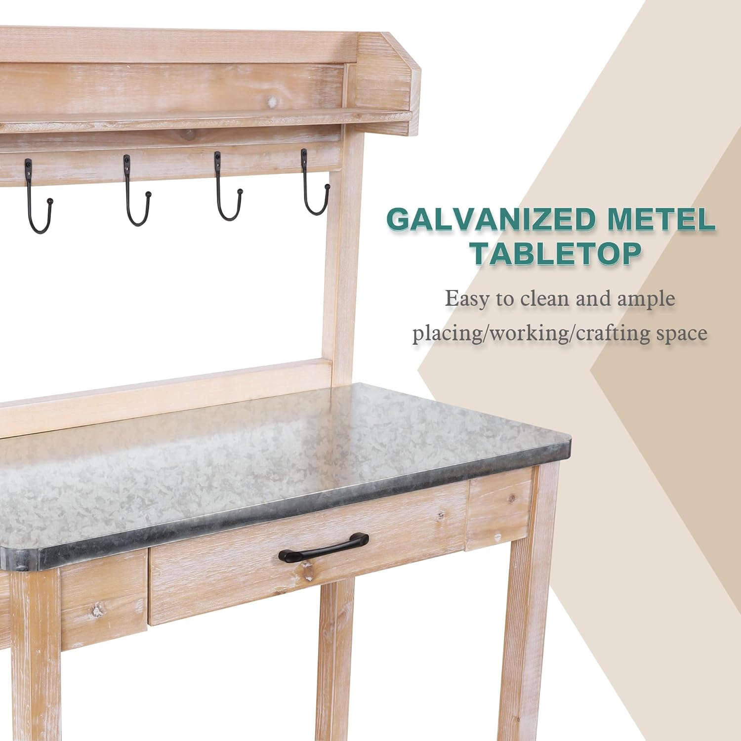 - 【Galvanized Metal Tabletop】Our garden potting table cover with galvanized metal sheet. It's convenient for you to take care of flower pots and green plants. Compare with wooden tabletop, the metal tabletop is more easy to clean and very suitable for plant care.