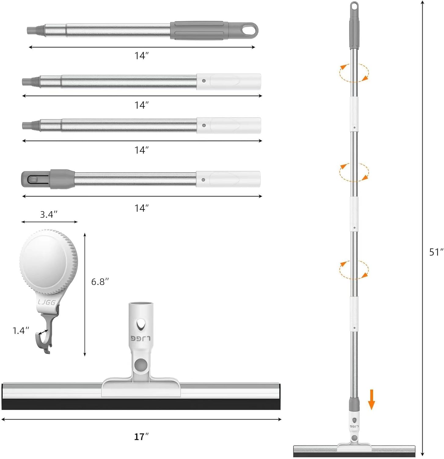 Squeegee Broom for Floor, 17" Rubber Squeegee with 51" Aluminum Alloy Pole for Bathroom Tile, Garage Concrete, Deck, Shower Glass, Window Cleaning, Squeegee Broom for Household Floor