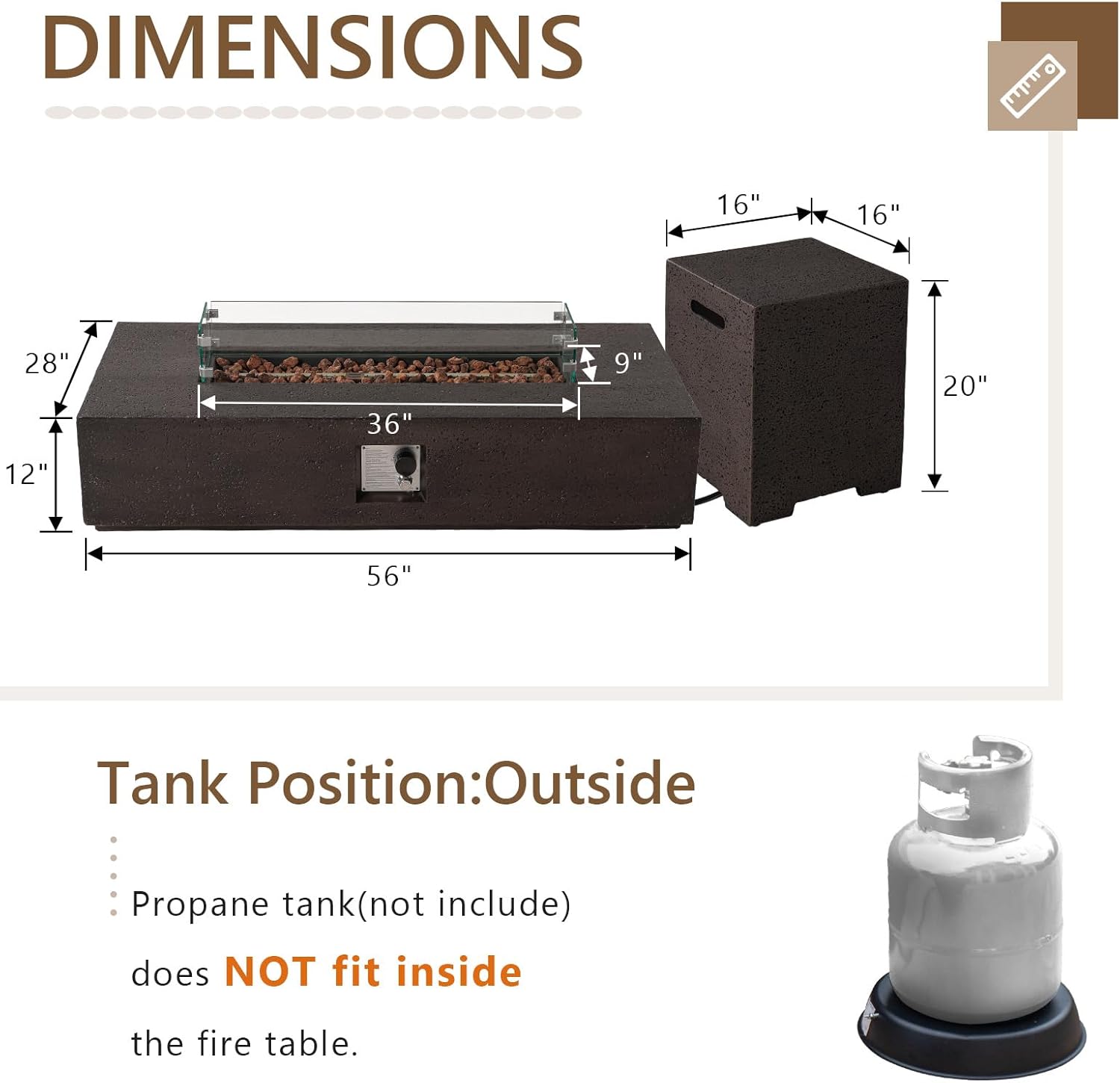 COSIEST 56 x 28 inch Outdoor Propane Fire Pit Coffee Table w Concrete Rectangle Base, CSA Certified, 50,000 BTU, Free Lava Rocks and RainCover, Fits 20lb Tank Outside, Wind Guard, Tank Cover, Brown