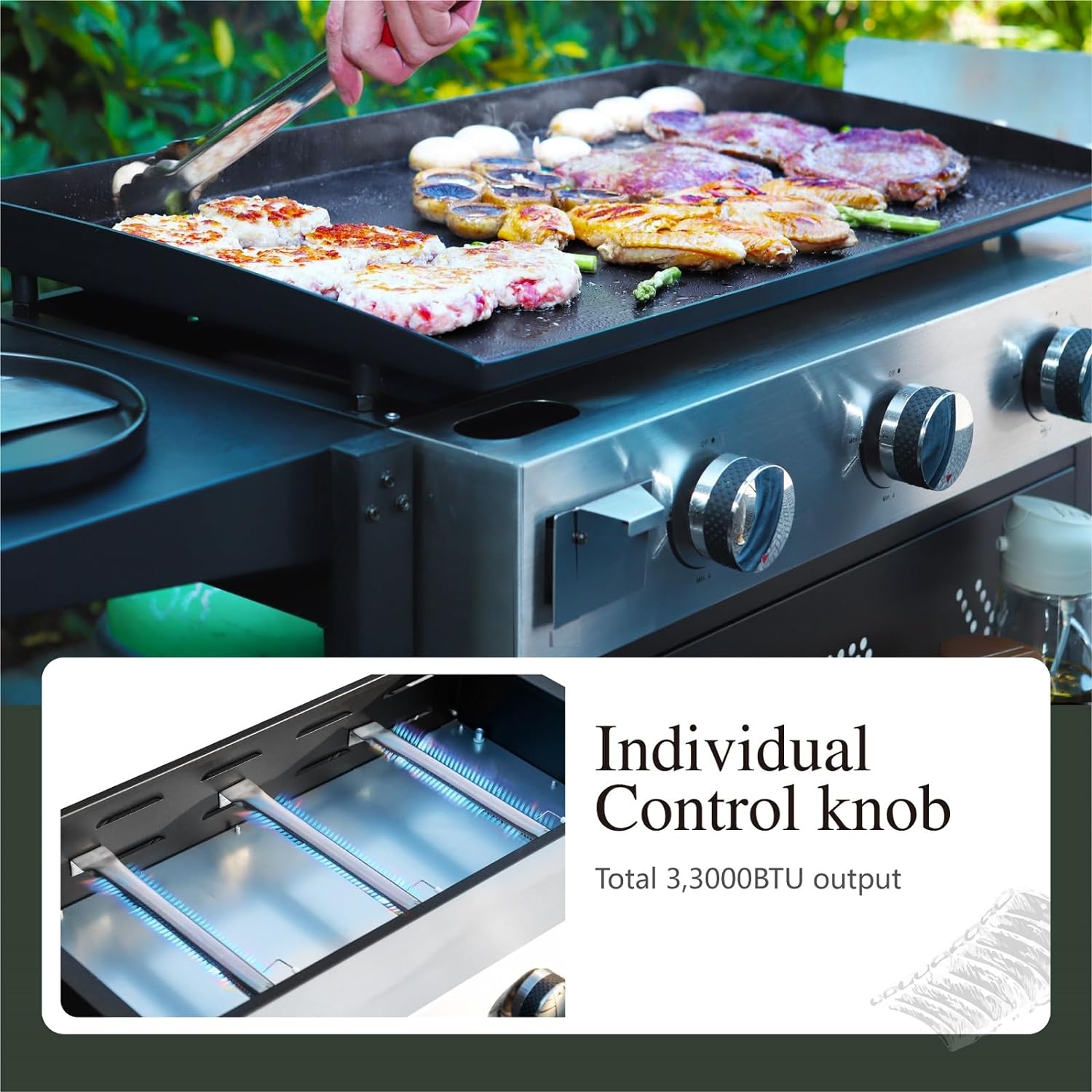 - 【Adjustable Heat Zones】3 independently Adjustable heat zones which provide a total of 33,000 BTU makes for a versatile cooking surface where you can cook several foods at once and not burn a thing. Also allowing the option to keep certain foods warm while others cook