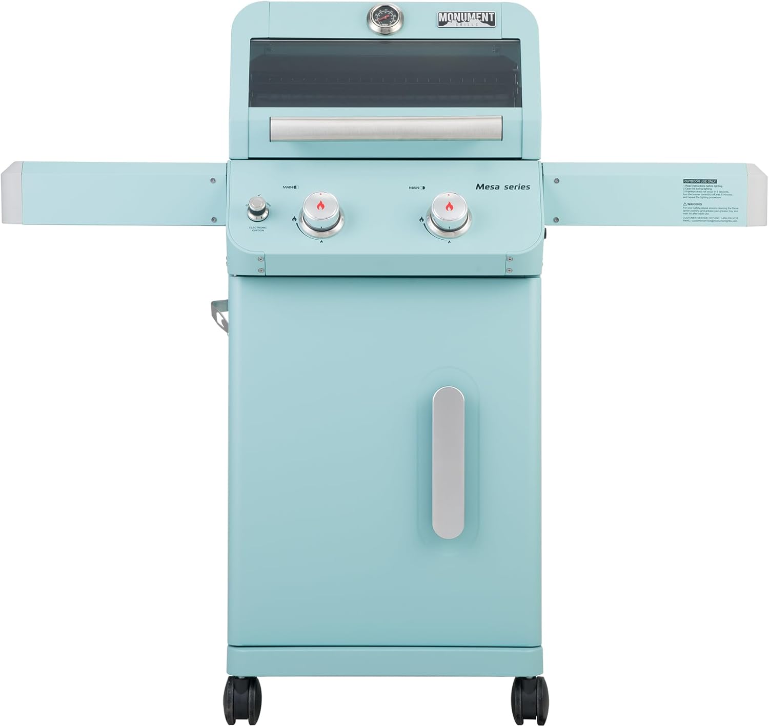 Monument Grills 2-Burner Stainless Steel Liquid Propane Gas Patio Garden Barbecue Grill with Clearview® Lid, Knob Control and Two Foldable Shelves Mesa200G, Green