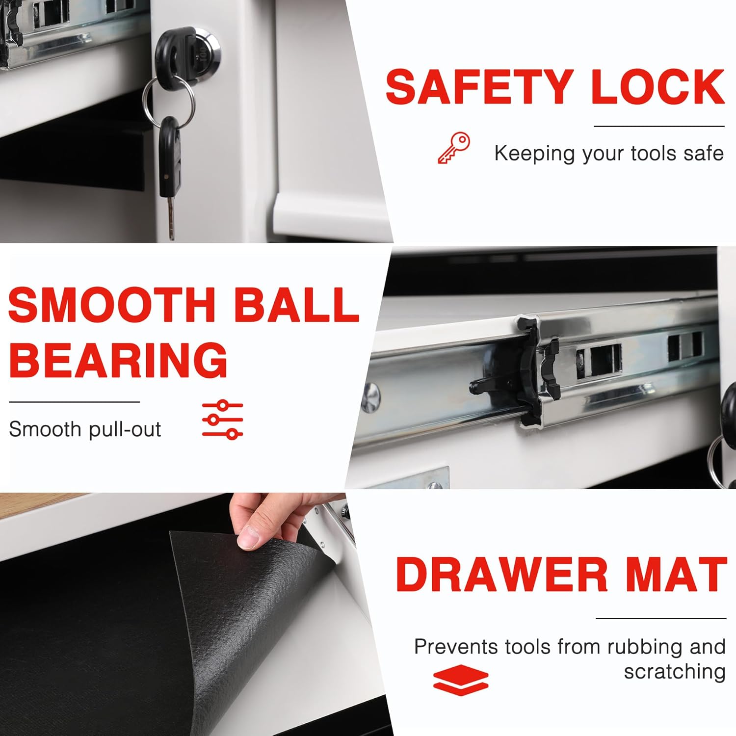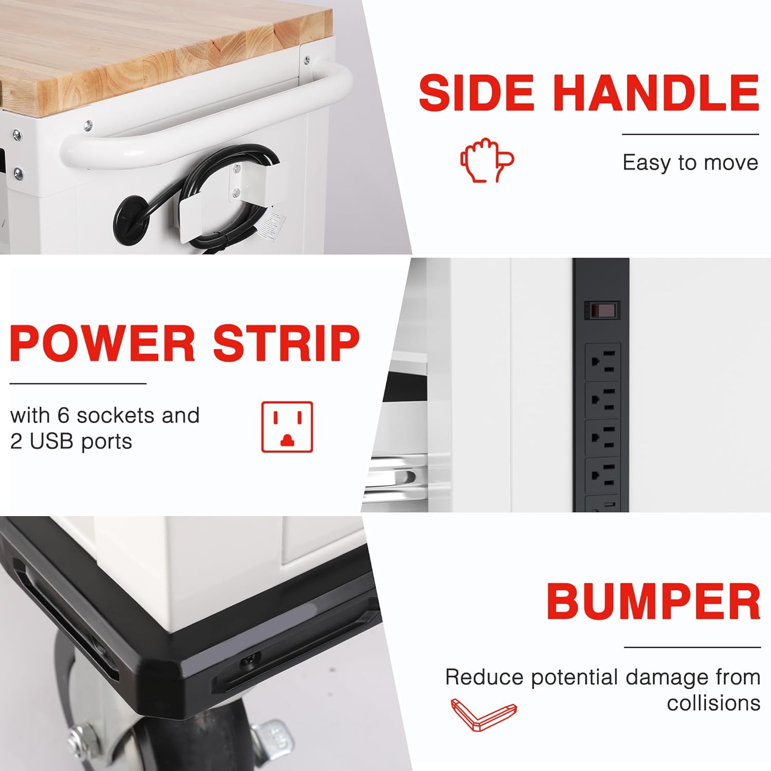 - High Load Capacity and Durability: Crafted from thick, high-quality steel plates, this rolling cabinet workbench boasts a sturdy structure and a powder-coated surface for easy cleaning and maintenance. At the top, a solid 1-3/8-inch thick wooden workbench provides a robust workspace that significantly enhances efficiency. With a maximum load capacity of 1000 lbs, it effortlessly supports a variety of tools and equipment.