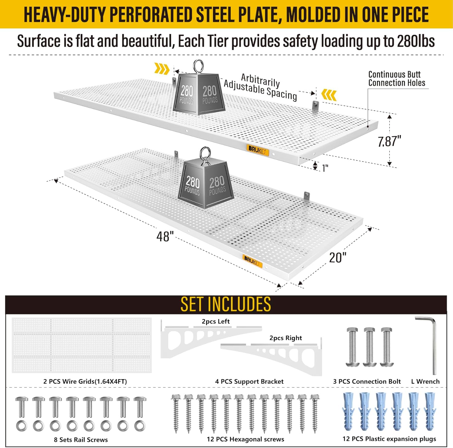 - KIT INCLUDES: Includes 2pcs of face plate; 4 Brackets; 12 Hexagonal screws (Hardened β 0.2" L/2"); 12 plastic expansion plugs, 8 Sets of rail attachment bolts; 1 L-wrench; 1 installation manual. All the hardware of Brukid professional series wall mounted shelves are under strict quality control and testing, we strive to provide our customers with a quality shopping experience, when you receive the product encountered any problems, please contact us at the first time, we will certainly give you a satisfactory solution