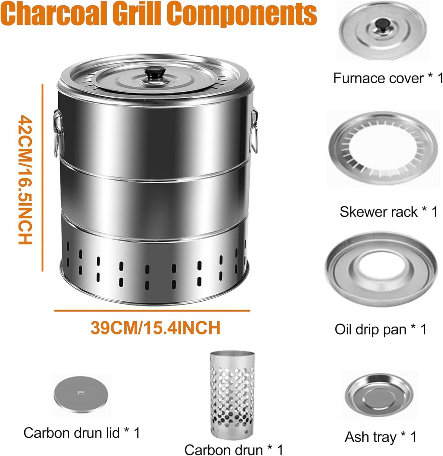 Stainless Steel Smokeless Barbecue Surround Charcoal Grill, Portable kebabs Charcoal Grill with Grilling Accessories Set, Diameter 15.4 inch/28 Kabob Skewer