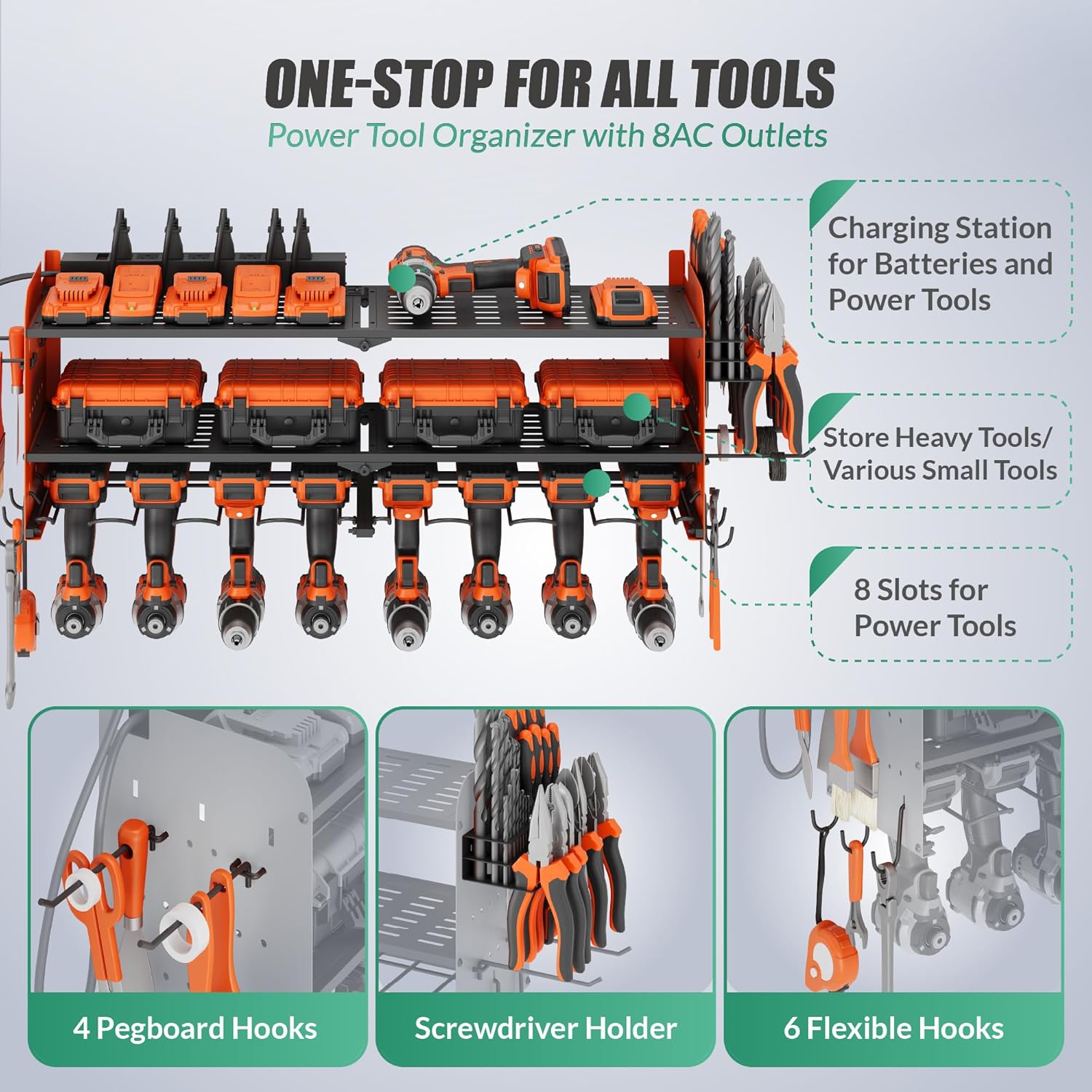 Suchtale Power Tool Organizer with Charging Station,33.2''Garage 8 Drill Holders Wall Mount,3 Layers Heavy Duty Metal Tool Shelf with 8 Outlets Power Strip, Gift for Men, Father, Orange