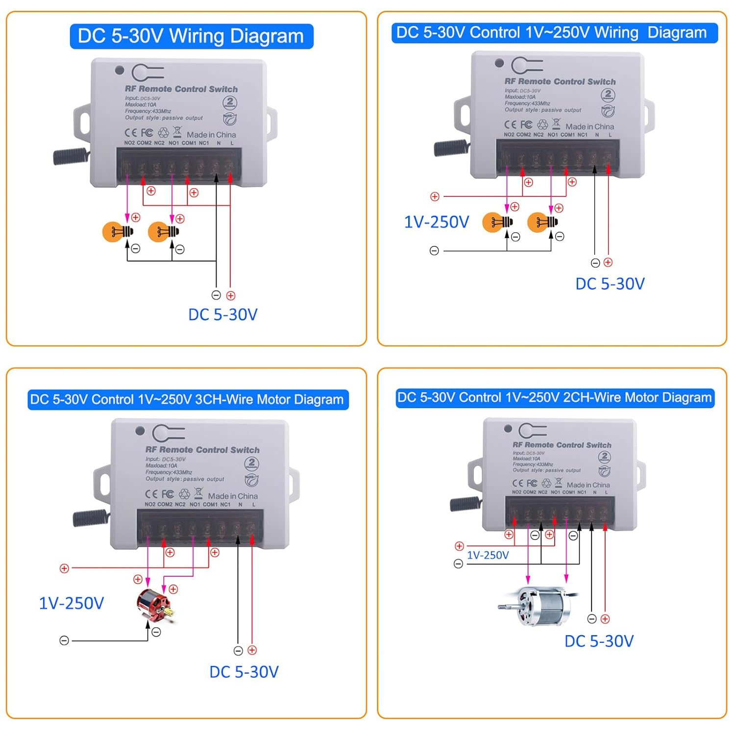 - 🍁【 wide applications range】The remote switches are used in industrial homes, farms, factories, offices, laboratories, supermarkets fields etc. Other applications, such as wireless monitoring equipment, Power switch, small motor, buzzer, electromagnets, light, electronic power supply equipment,, Motors, Fans, Cameras, Video signals, Audio signals, electrically operated Doors/ Locks/ Windows, ventilation devices, signal transmission.