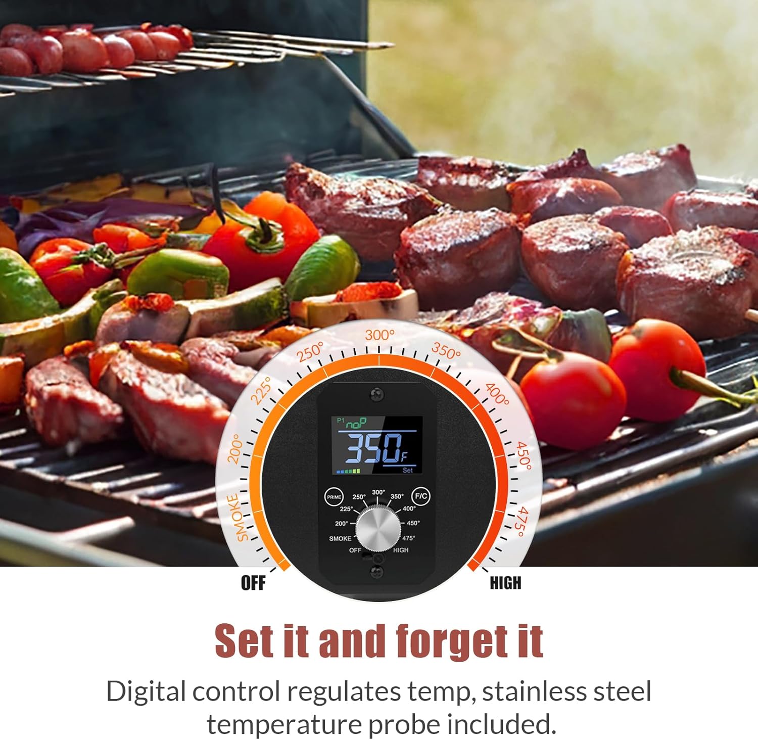 - 【Premium Features】: LCD screen and meat probe to show small smoker temperature and probe temperature (free Meat Probe included). Large capacity hopper can accommodate 5lbs wood pellets. It also can be run from a small car power inverter. The combination of superheated steam and pellet grilling enables you to create tender and juicy wood-fired flavor roasts